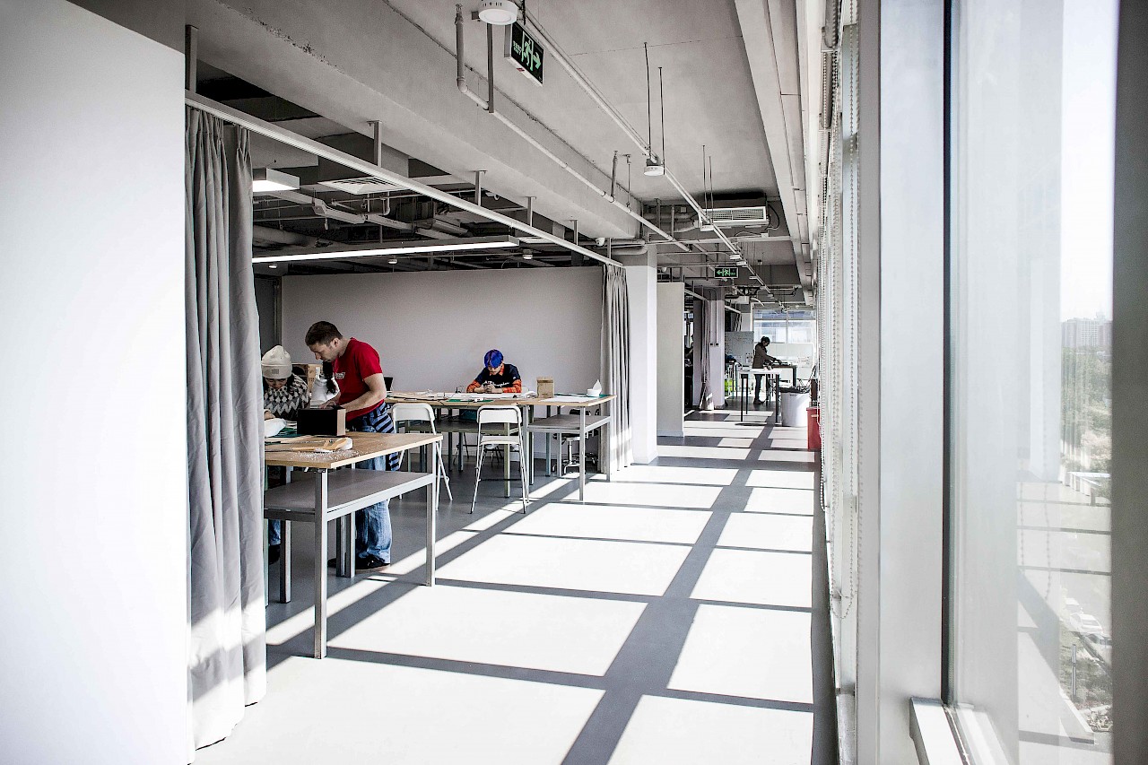 走廊因为位于工作室外侧,助于遮挡夏日的光线直射。当有课时,工作室的窗帘将房间和走廊隔开,减少噪音。为了保证开放的功能,所有会产生噪音的功能被布置到工作室单元后面的玻璃盒子中。