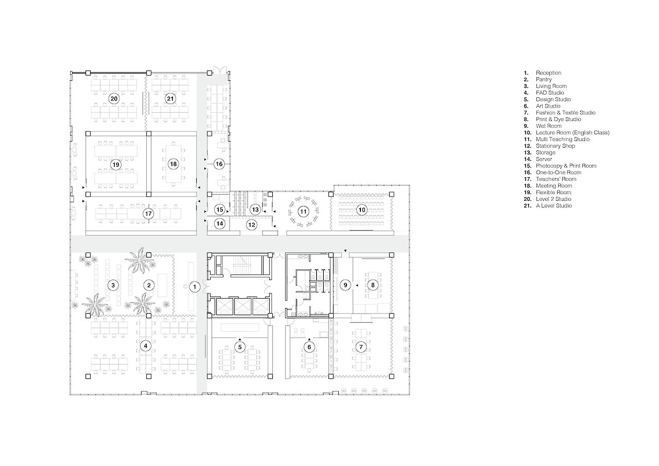 叠术为北京国际艺术教育中心设计新扩建部分时采用了创新的循环流线概念,改造了传统学校规划,为学生们提供了一个充满活力的学院。该设计充分考虑到了学生的互动、探索和寻求灵感的方式。
