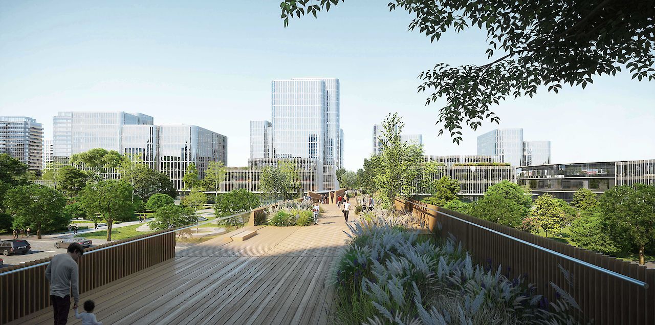 总体规划四侧相邻的崇阳溪沿岸绿地延伸并形成一个 “生态主轴”。为了强化绿色生态的概念,叠术设计了四座宽阔的生态桥,将项目的四个地块连接到一起。通过建筑体量和柱网的调动,场地向外围开放,为办公楼创造良好的入口区域,并可以直接看到西南方的轻轨站。建筑体量创造了两种办公类型:南面的办公塔楼定位商业街和商业地标,沿 “生态主轴” 则设置成了灵活的独栋办公。