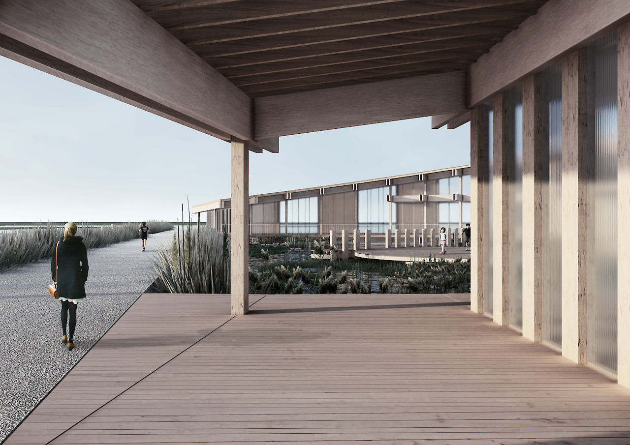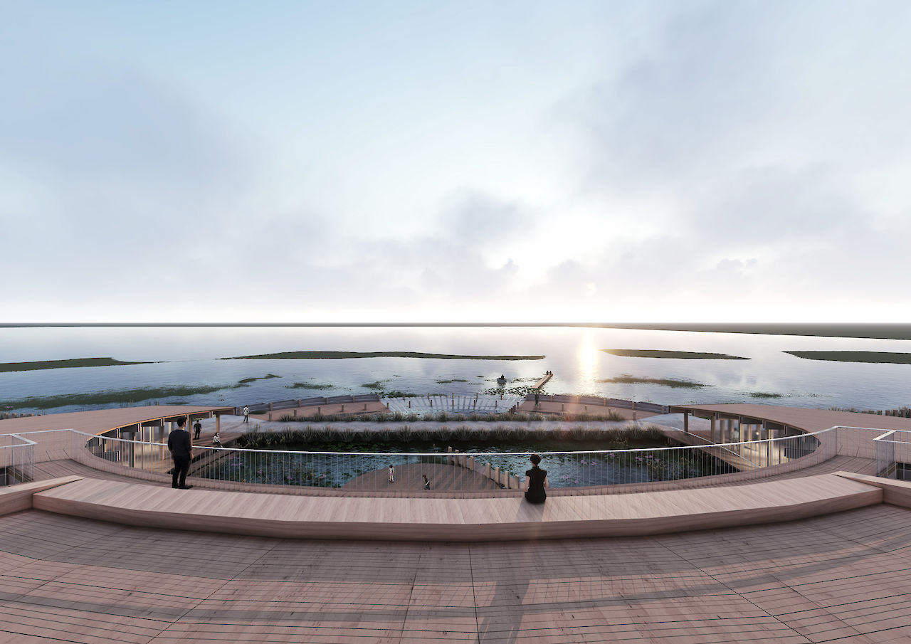 叠术参观了基地,并决定将新的体验和教育中心设计得尽可能靠近农耕点,甚至成为其中的一部分。圆形的底座形状是在两种不同类型的小龙虾湖之间的现有堤坝上“叠加”的。该项目以其卓越但显著的位置,成为农民和游客之间的一座桥梁,促进游客和农民之间的互动。堤坝也提供了进入展馆的通道。