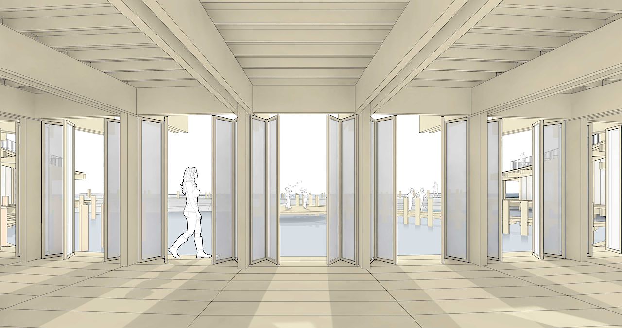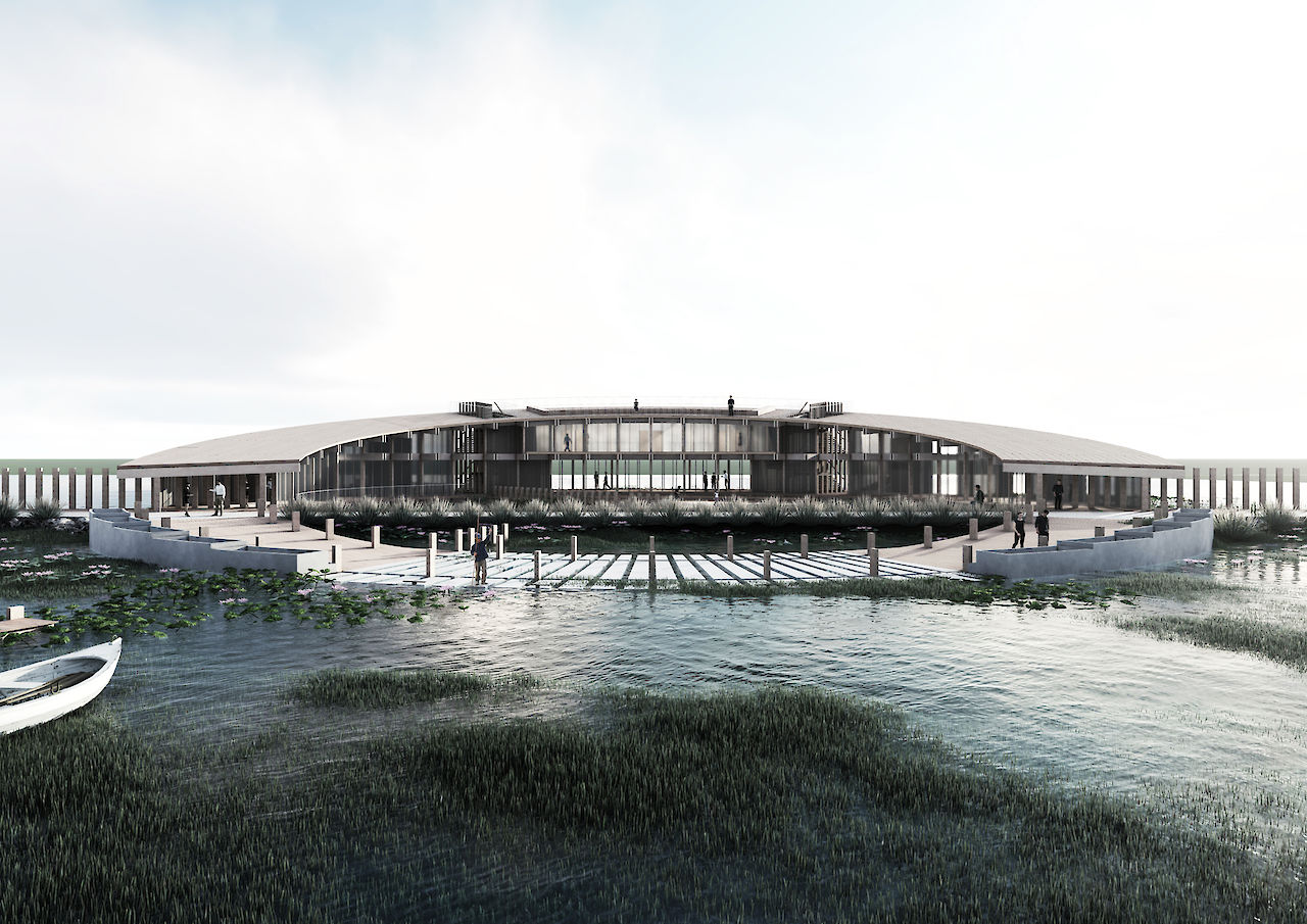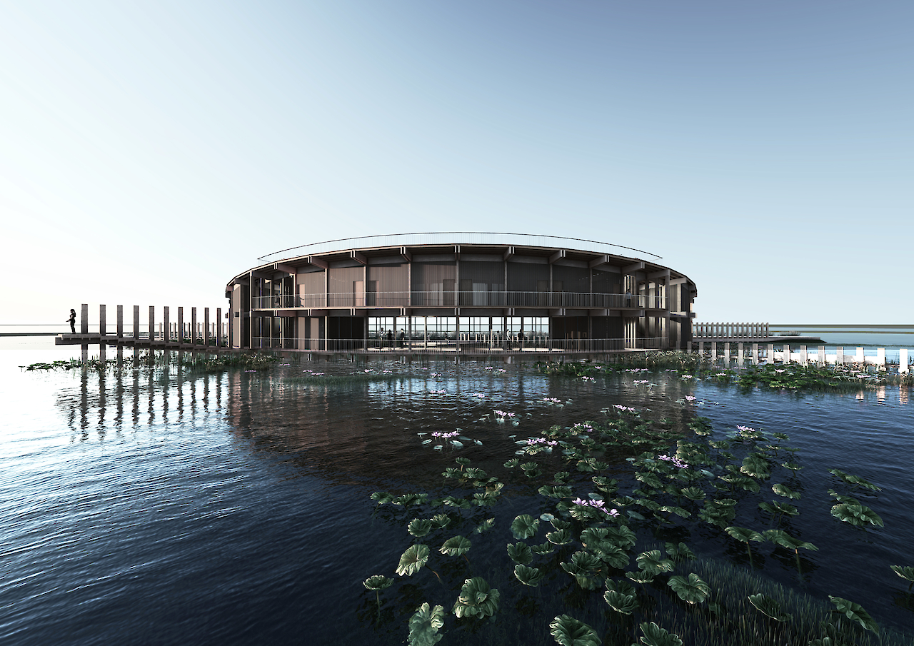 有节奏的木结构环绕在建筑周围,给建筑一个清晰的结构和可识别的框架。在外观上,圆形设计有桥梁延伸到农田,使游客能到尽情接触到自然。这些桥梁给人们创造了在农田中探索和思考的机会。圆圈位于荷塘周围,有一个表演的中央舞台。贯穿建筑物的堤坝为实现不同的功能创造了无障碍环境。