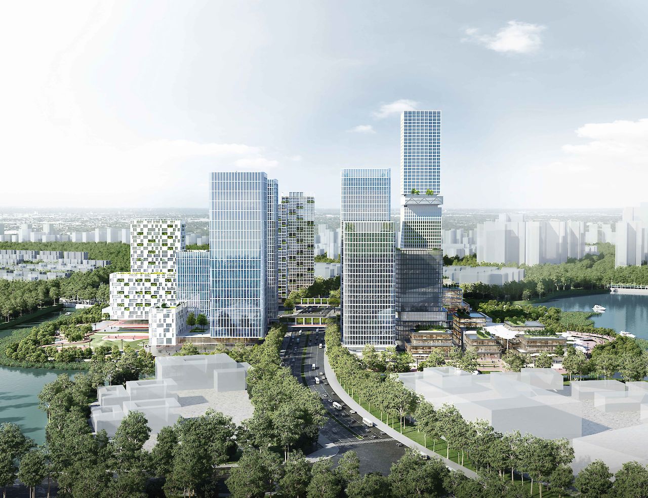 政府将板块的部分区域淹没,创造了一个岛屿。岛由四个地块组成,被两条道路分隔。其中,东到西的道路下方也是地铁穿越该项目的路线,因此叠术的设计意图是由地铁站为核心的TOD发展模式。此外,叠术在设计融入了绿色公园和充分的休闲区域时融入了以人为本的原则。