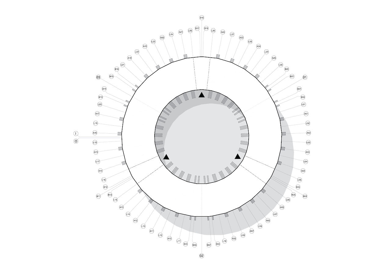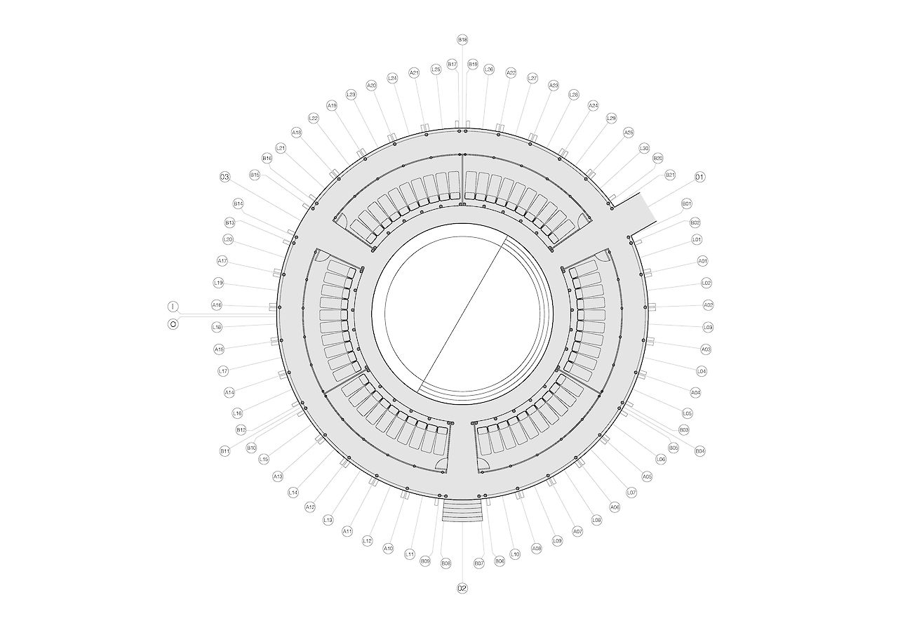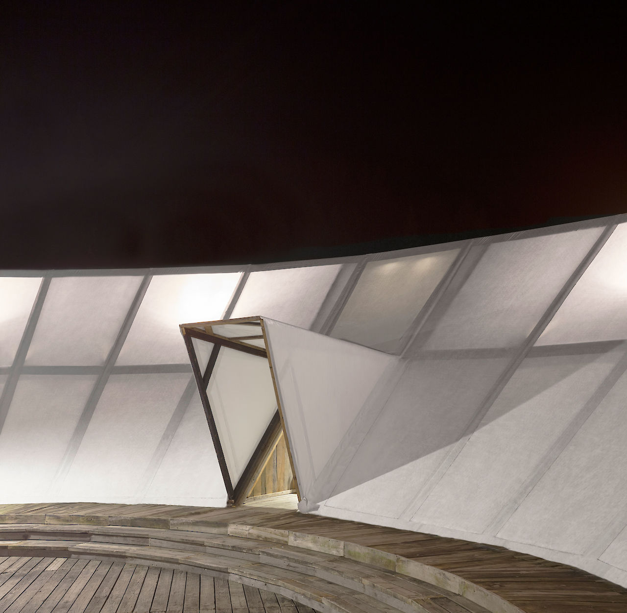 圆环形帐篷的设计基于微社区的概念。中间围合出一个圆形的户外平台,作为户外活动和学习的空间使用。白色帆布制成的圆环空间作为住宿使用,被三个开口分成三个区域。外圈廊道空间与周围的竹林相互交融,也提供了交通空间,使得内院平台有活动时不会互相干扰。架空的建筑结构将对稻田的伤害减至最小。结构剖面是直角A型木框,形成简洁纯净的外观,而内部空间则向天空开放。