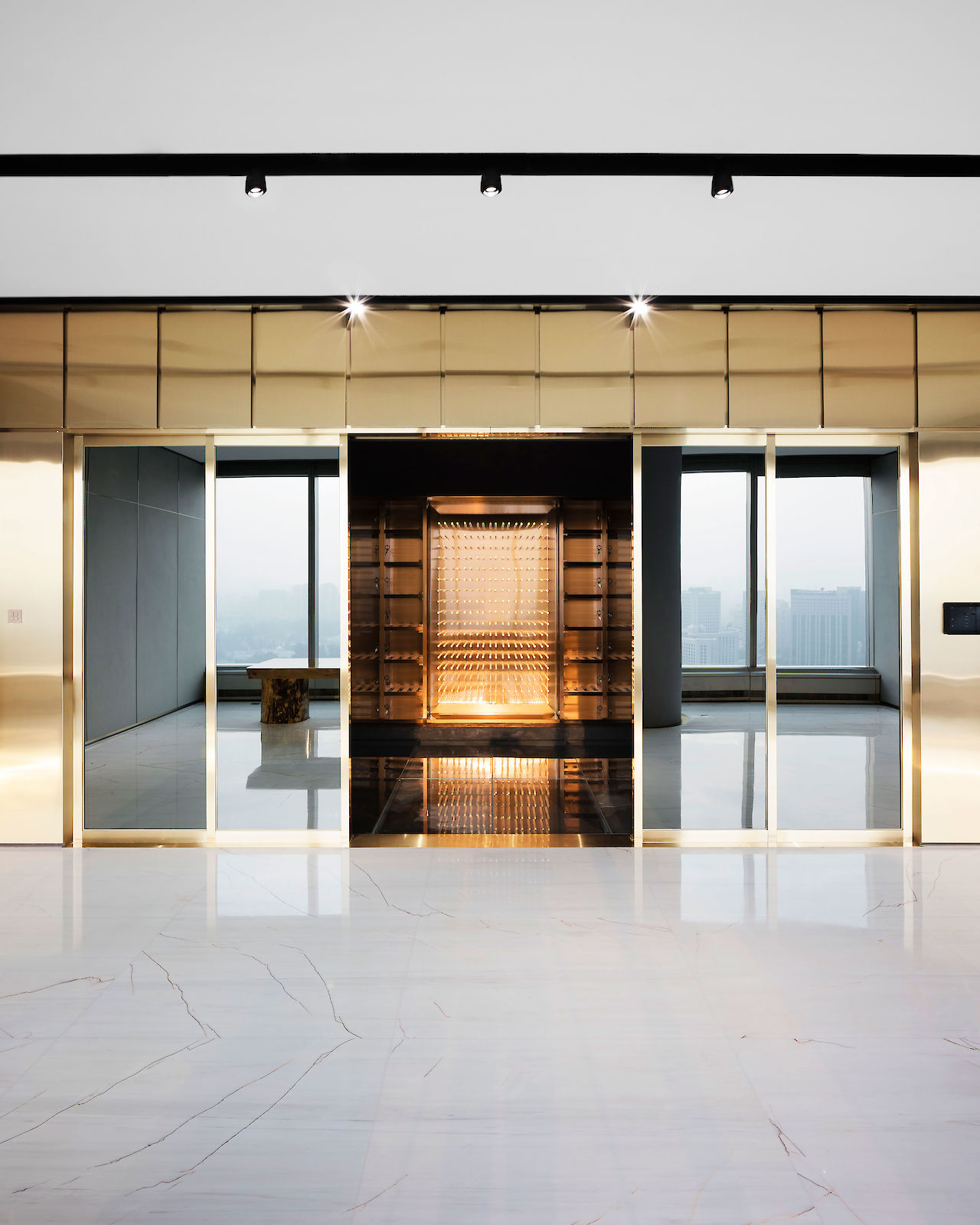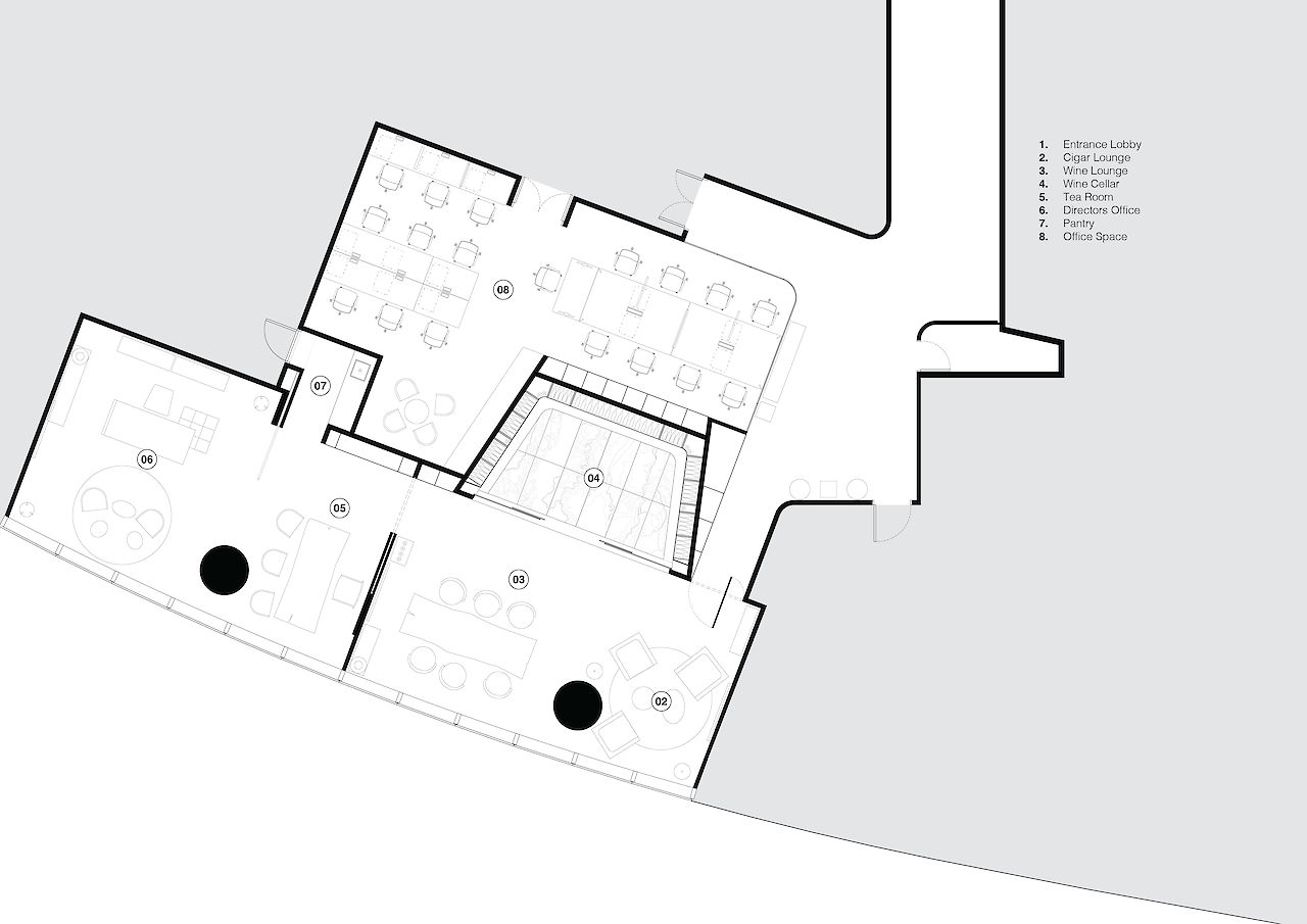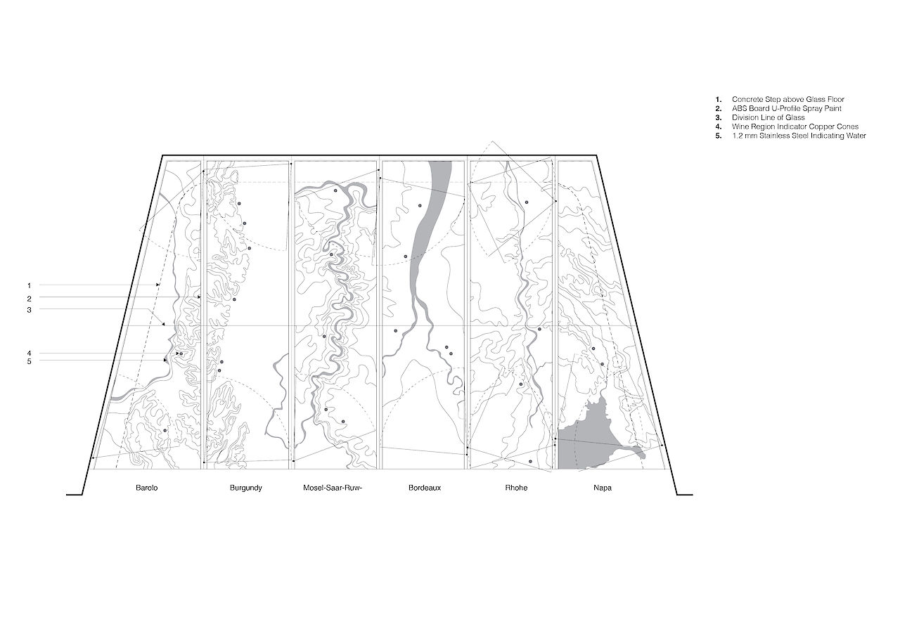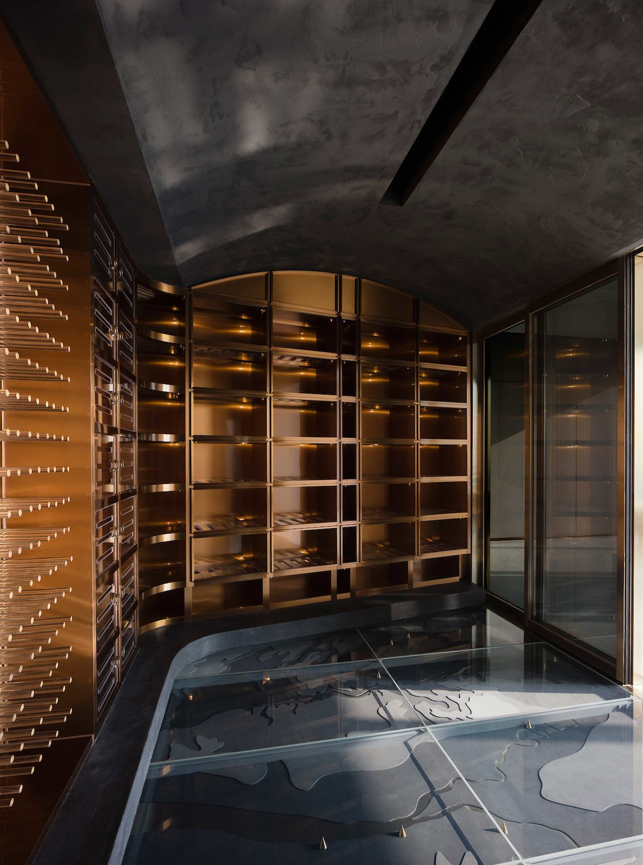 中央分隔体的一部分是由深色的镜面玻璃制成,玻璃的镜面映射着城市轮廓,而把“空中酒窖”隐藏在另一面。“空中酒窖”的设计是对传统酒窖的重新诠释。会员通过自动平开玻璃门进入隐藏的私人酒窖。酒窖面积25平米,可储藏500瓶红酒,红酒分别来自波尔多,罗讷河谷,勃艮第,纳帕,摩泽尔和巴罗洛这六个世界知名的红酒产区。白天,镜面玻璃门将酒窖隐藏起来,并保护其中的红酒免受阳光直射。镜面门使得会员在酒窖内也能观赏到城市风景。夜幕降临后,酒窖灯光开启,500瓶红酒在主体空间中显露出来。