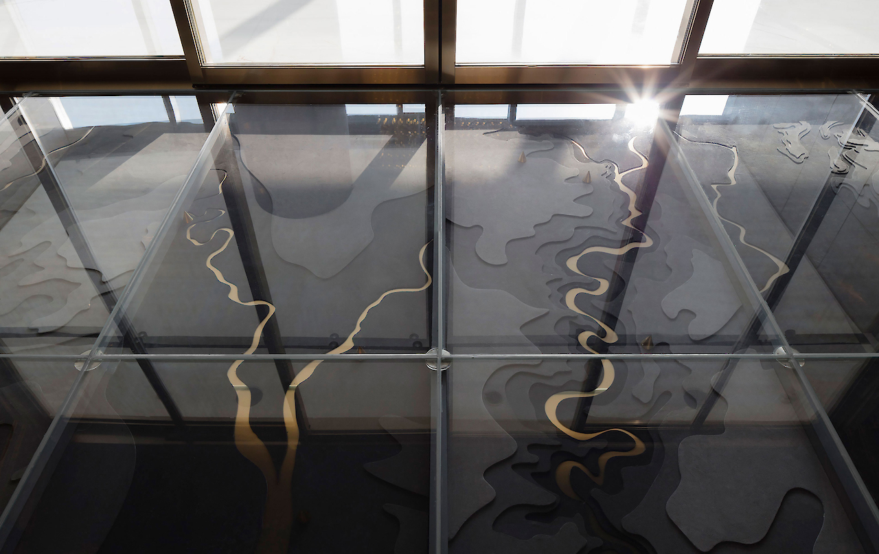 酒窖的玻璃地面下方是六大葡萄酒产地的抽象地图装置,并带有自动感应灯光。叠术在设计装置时,运用了混凝土作为地图地貌,河流则用不锈钢材料诠释。酒架材料为不锈钢,巧妙的亚克力底座设计,可以有多种不同的酒瓶储放方式。酒瓶既可以平叠摆放,也可以倾斜摆放。与此同时,亚克力底座设计也完美地优化了酒窖内部的光线分布。
