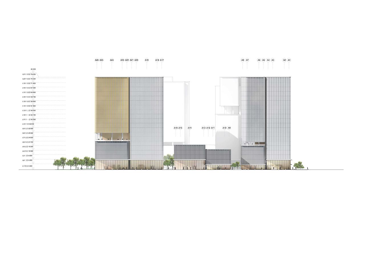 所有塔楼、道路、消防登高面、停车入口和落客区都被布置到在场地外围,地块正对面的城市绿地也被融入设计中使花园的面积最大化并达到10000平方米。空中花园的平台用作为酒店的大堂、报告厅、食堂和办公设施等。景观缓缓地向北抬升,下面设置商业空间,既延伸了商业街道,又不破坏景观的整体性。斜坡是绿化带的延伸,为游客创造了独特的体验。文化馆位于绿色斜坡的中央,成为了该混合功能项目的核心。