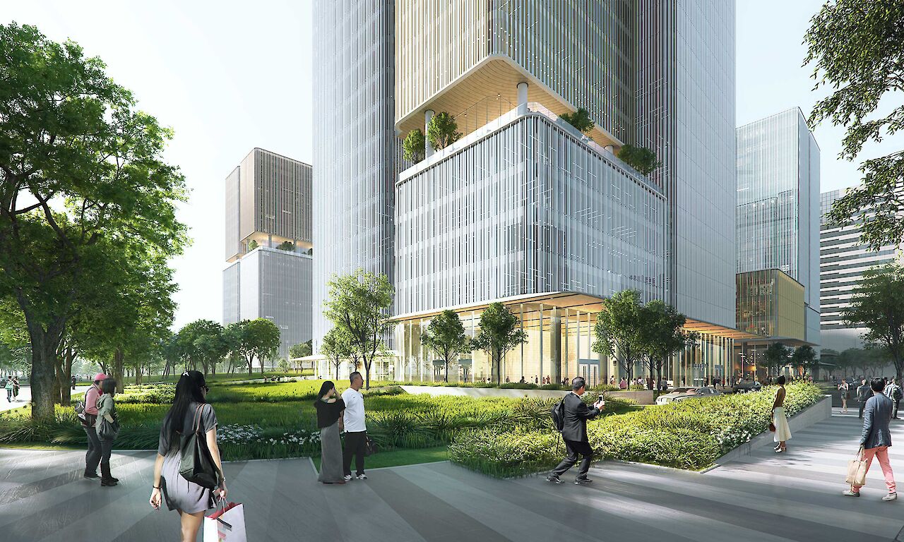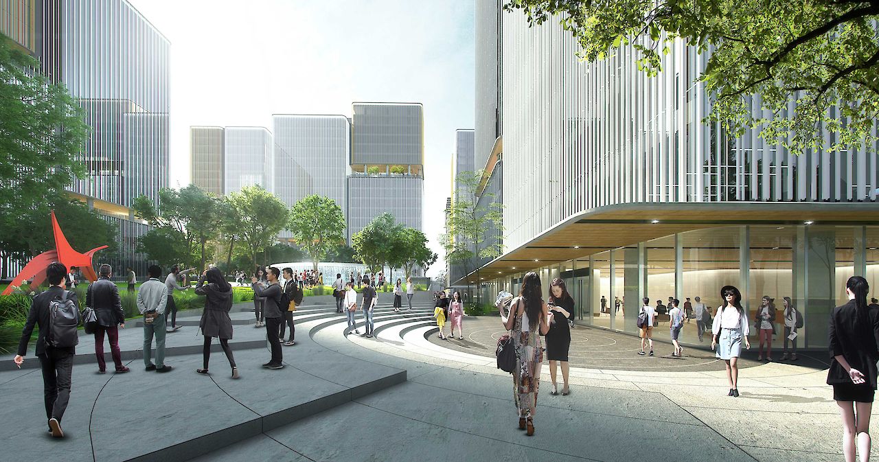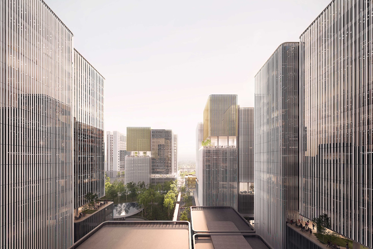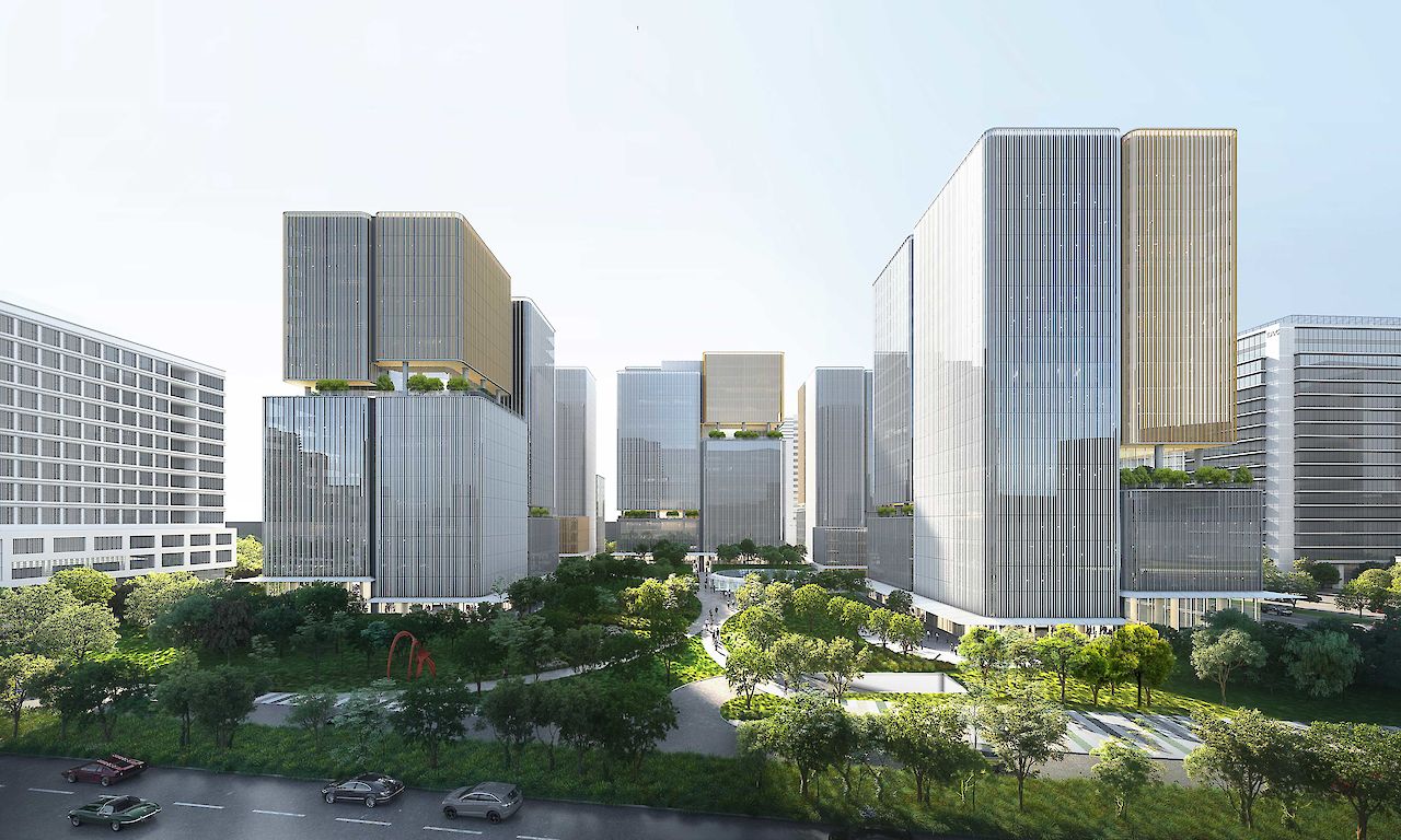 叠术建筑在设计位于杭州黄龙中心城区的“空中花园”时,以绿色城市的理念为主,将场地划分为两个特色鲜明的区域:城市边缘和中央绿色公园。这个商务办公项目的亮点是10个分散在基地中漂浮的“空中花园”,为这个密集的中心城区提供了有价值的公共空间,并策略性地将建筑体量打散。这座面积达21万平方米的大型开发项目是一个独一无二、生机勃勃的混合功能项目,必将吸引顶级企业进驻。