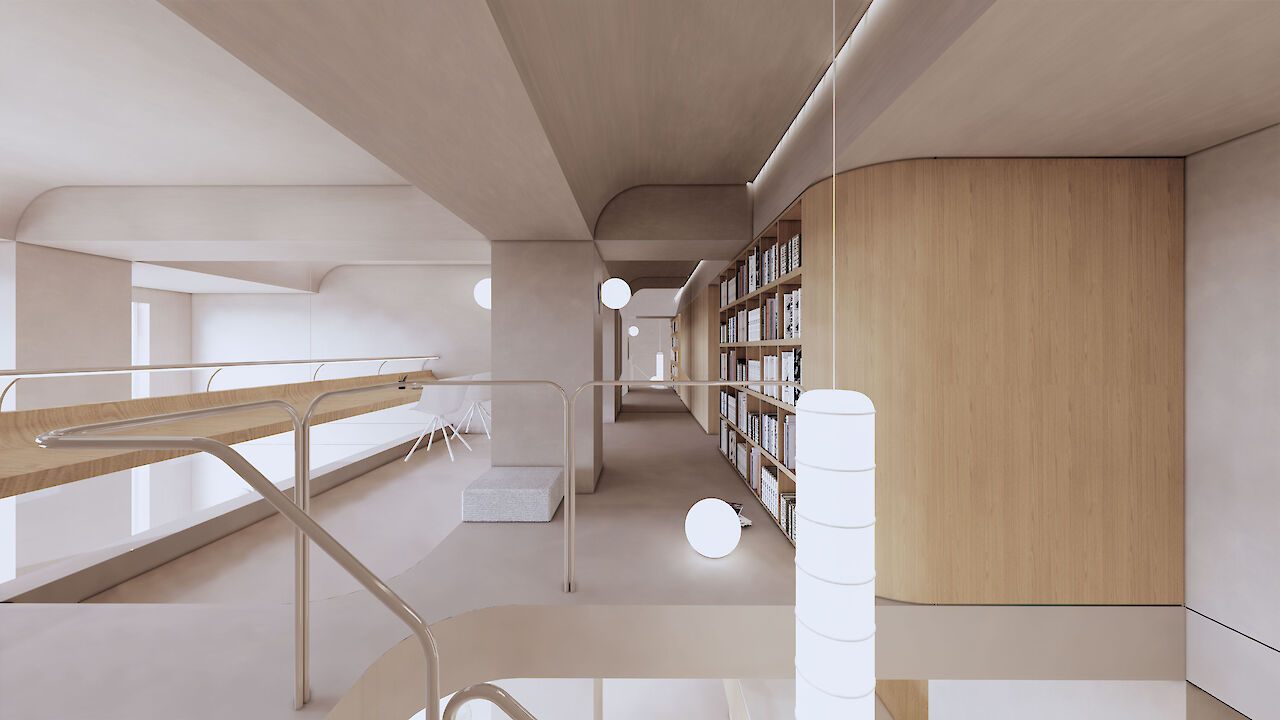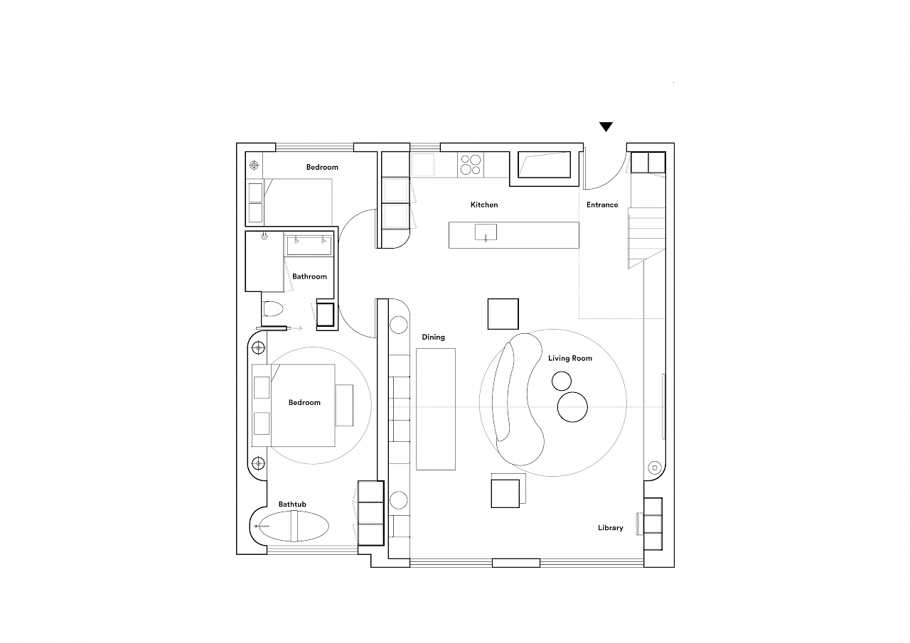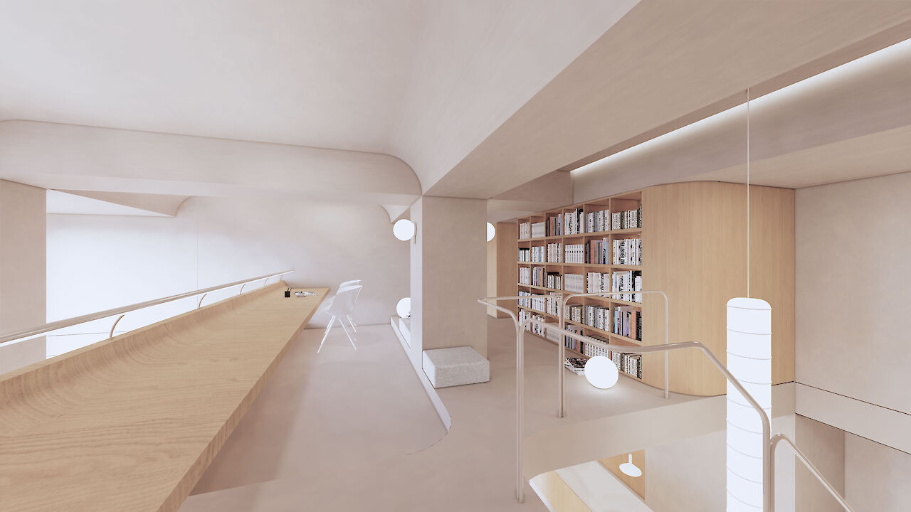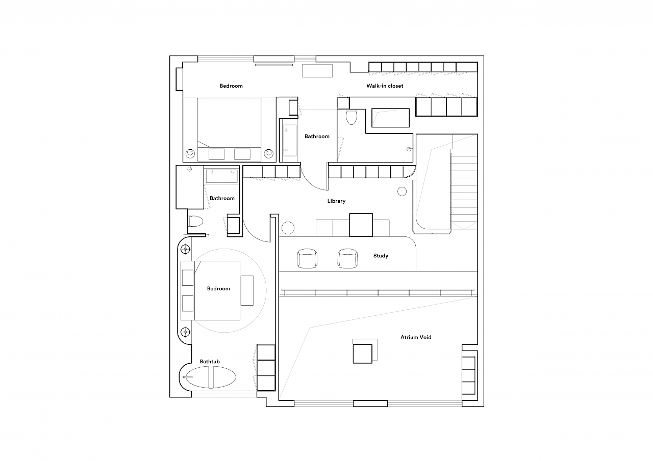 一层局部空间被设计为通高区域,沿着立面的客厅和餐厅拥有了充分的采光面积并体现了开阔通透的感觉。楼梯位于公寓的通高前厅使入口显得很宽敞。 客厅上方的夹层阅览空间引入了图书馆的概念以展示公寓的特色。