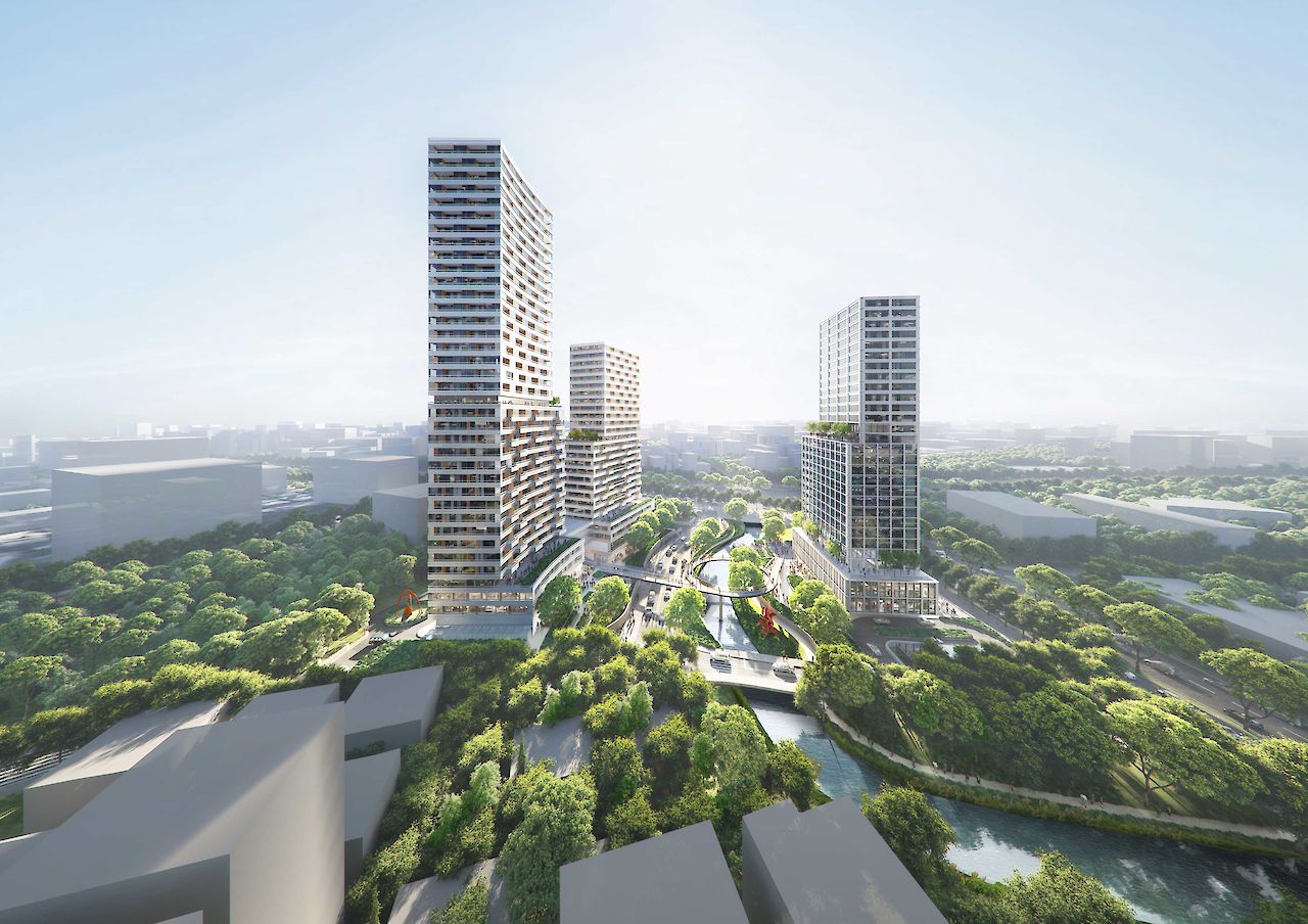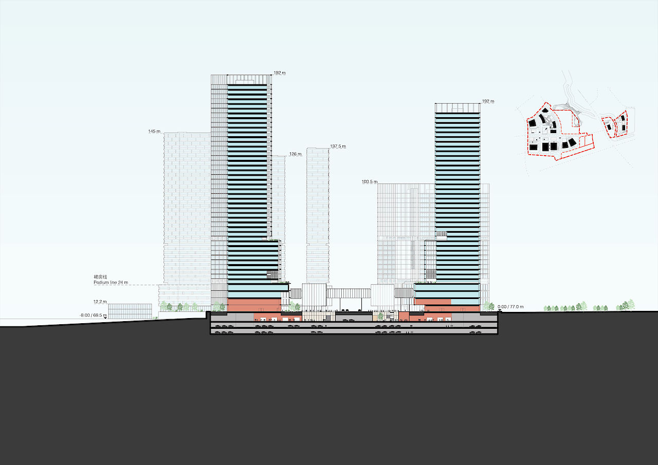该项目的设计考虑到TOD(交通导向开发)的概念。每个地块与地铁和公交车站无缝连接,24小时“5分钟生活圈”循环。落客区和汽车坡道被布置到靠近道路的位置,将地块内的汽车流线降至最低。无车集中步行区创造了一个友好的公共领域。