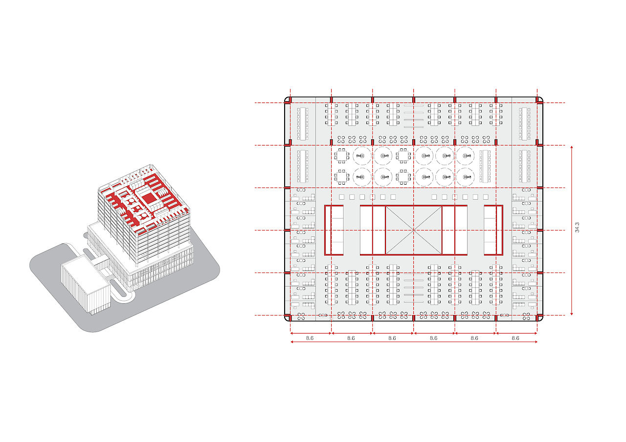 塔楼分为3个不同的区域:底部、中部和顶部,为不同类型的租户提供三个使用率高的工业厂房和办公的标准层。推台式塔楼的底部有最大和最深的楼板,可供工厂使用。中部的楼板较深,适合研发公司,足够容纳更大的设备和实验室。塔顶则设计为标准的A级办公楼标准层。