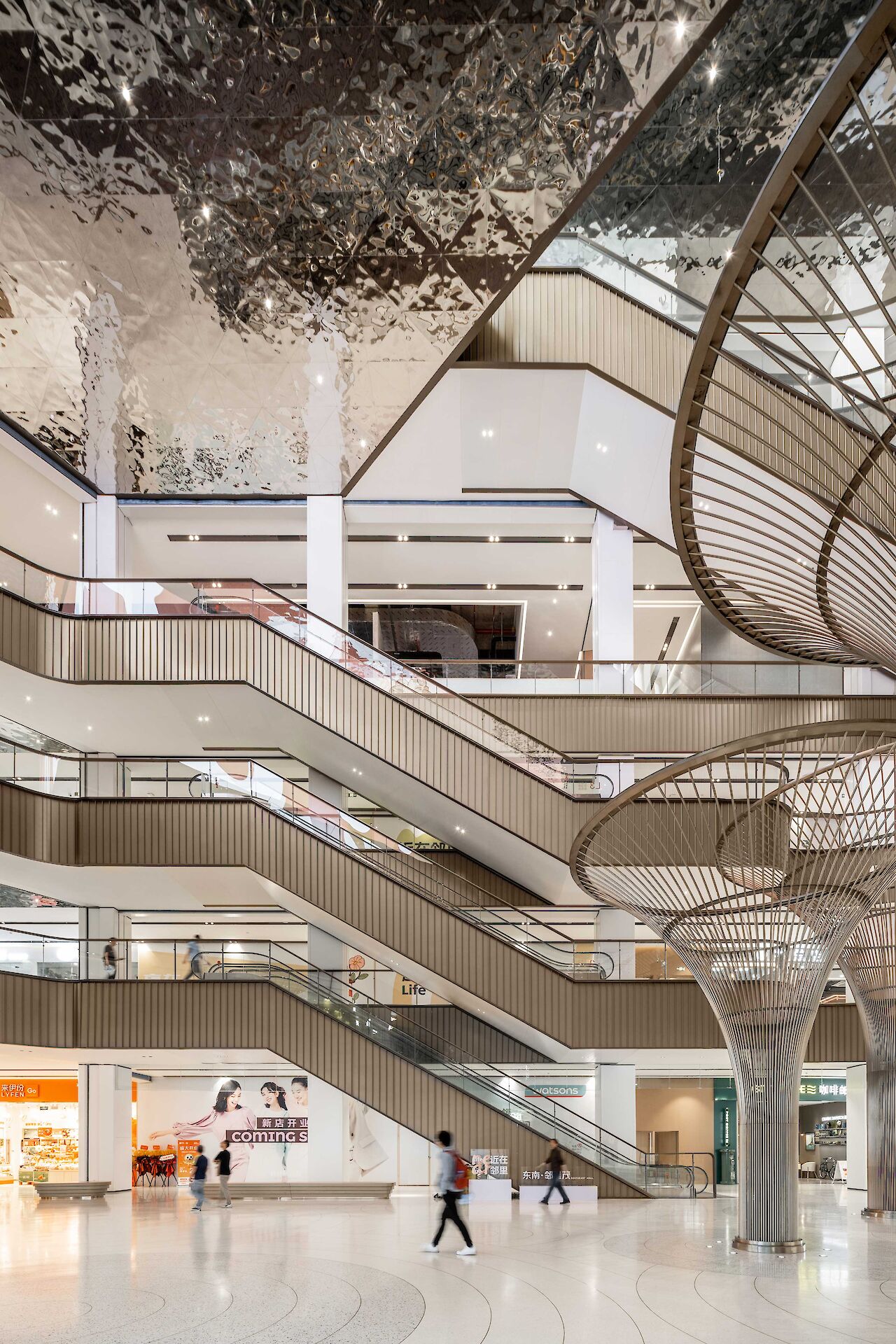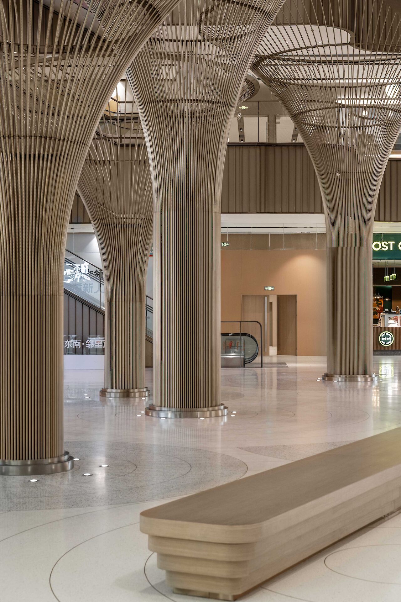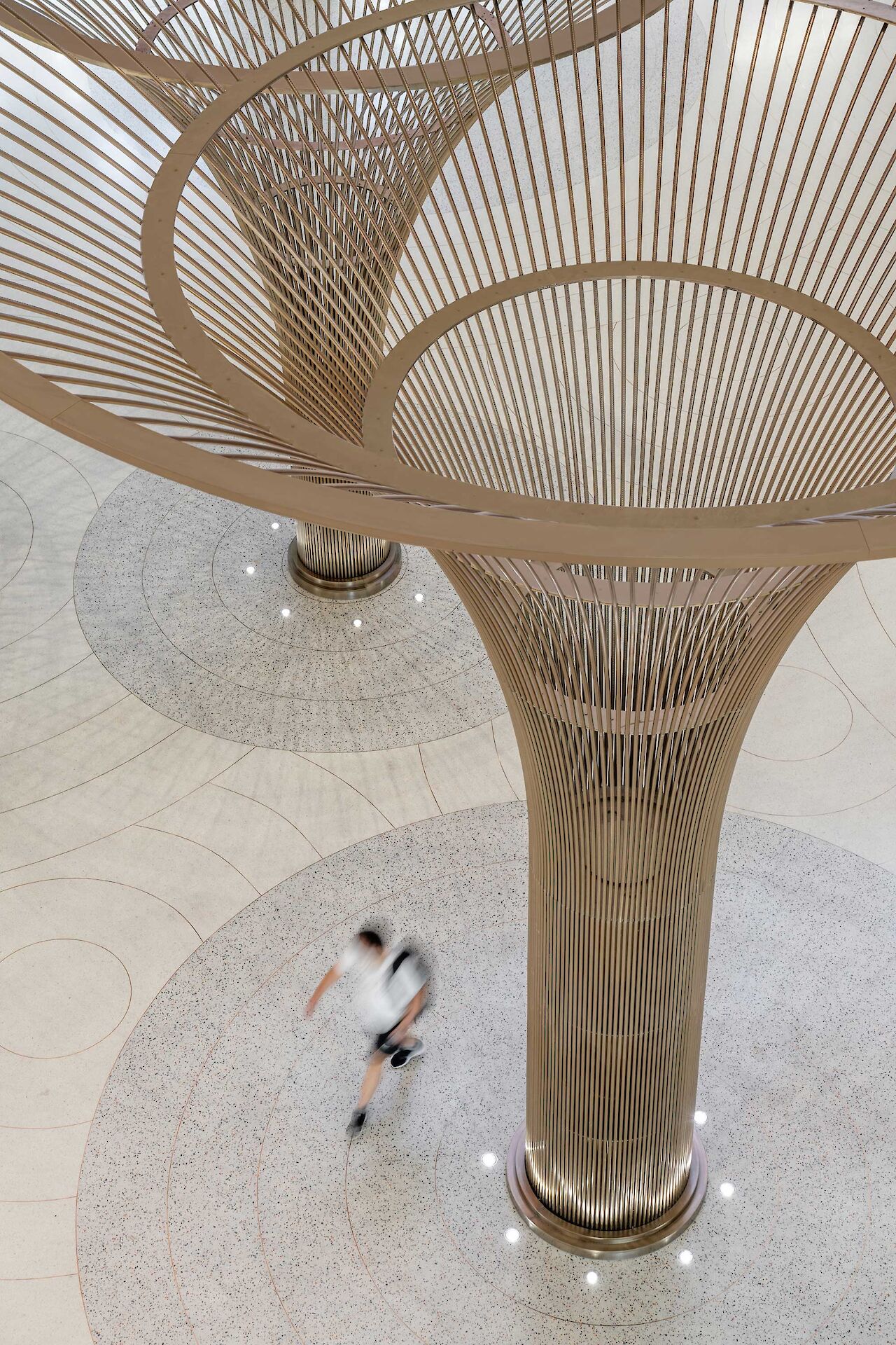 To enhance the visitor experience, the brass tree installations take center stage in an hourly light show, where the atrium lights automatically dim, casting a spotlight on the intricate design of the self-illuminating trees. The choice of brass as a material extends beyond the tree installations, unifying the entire development. Balustrades, lift doors, escalator cladding, and other architectural elements incorporate brass, creating a harmonious and holistic visual identity.
