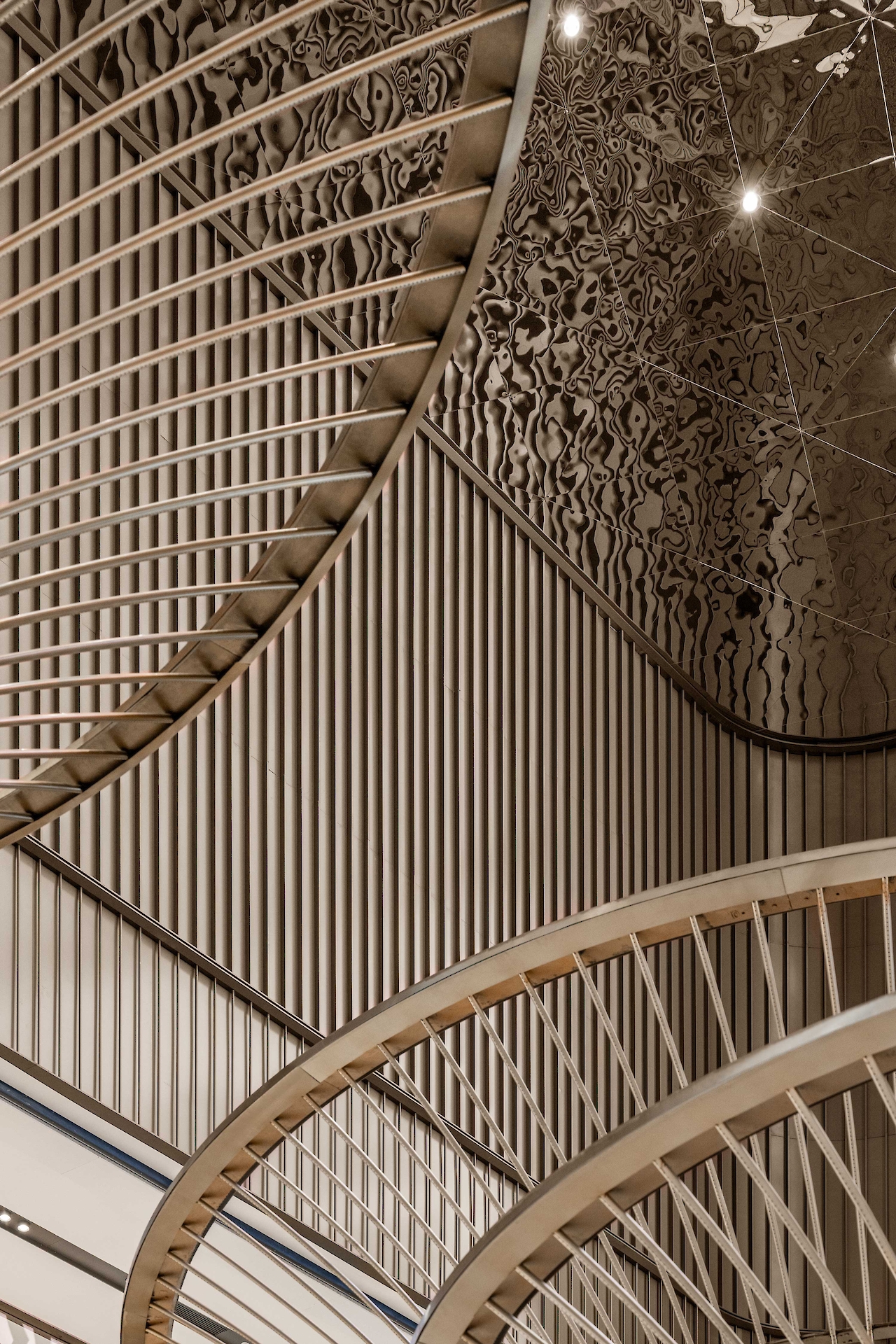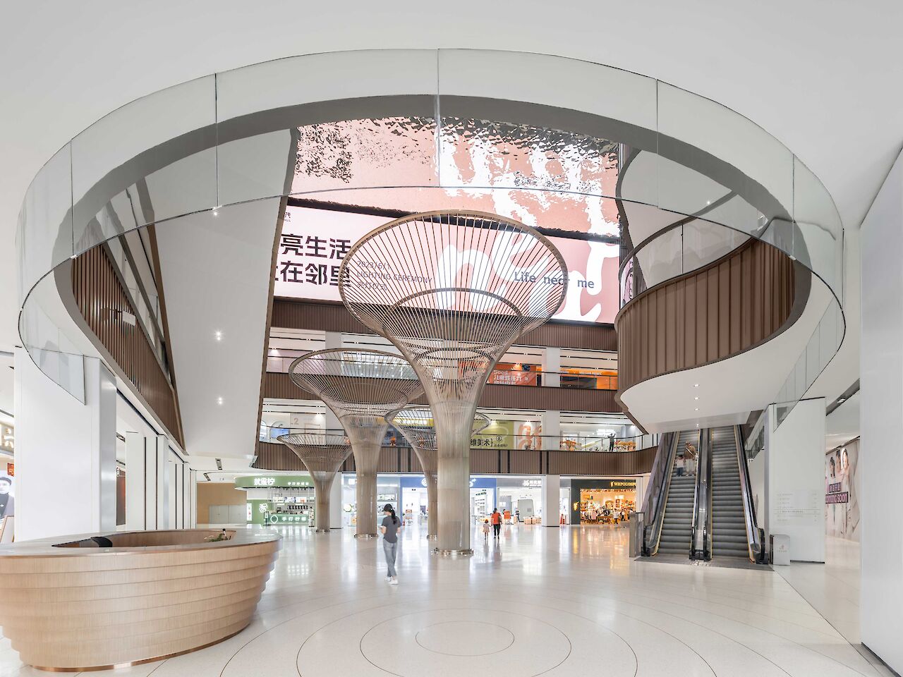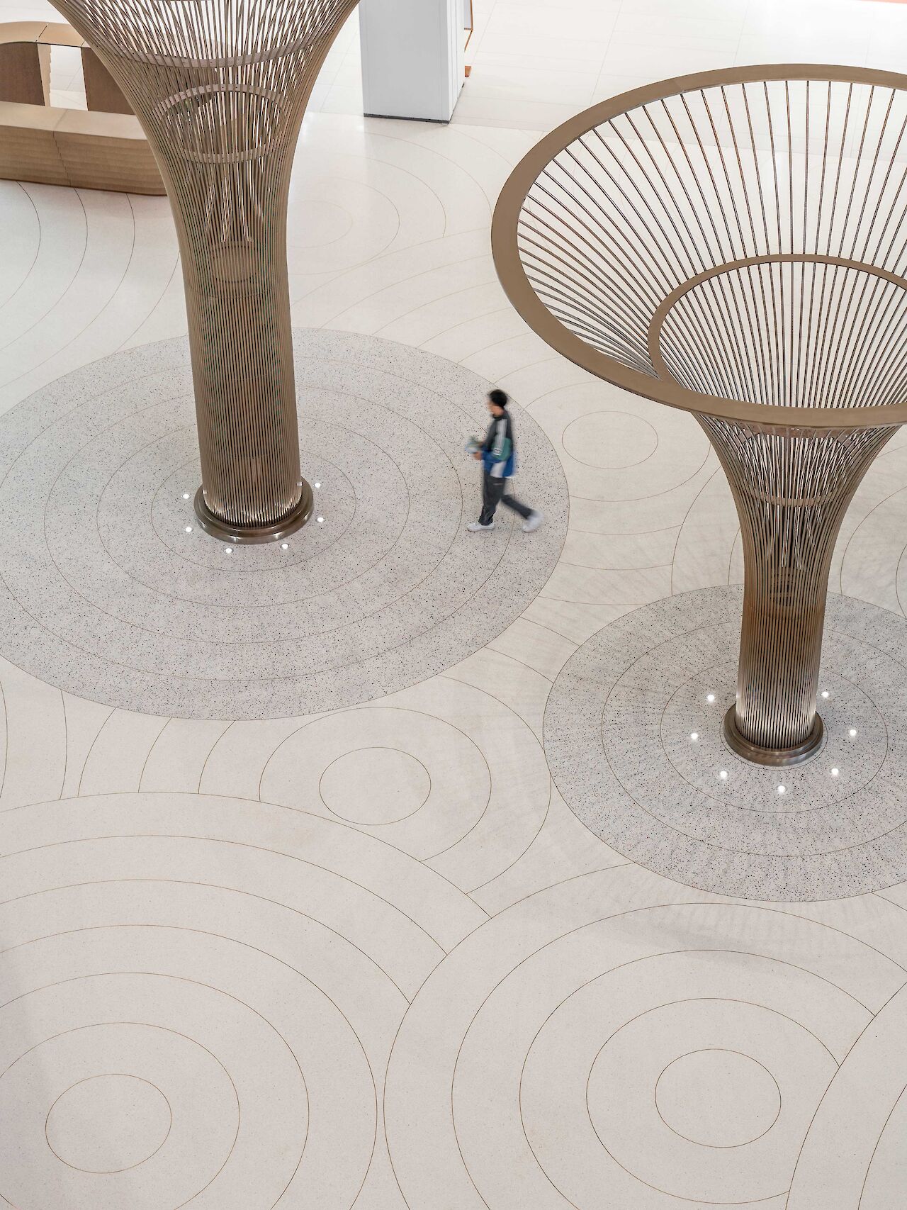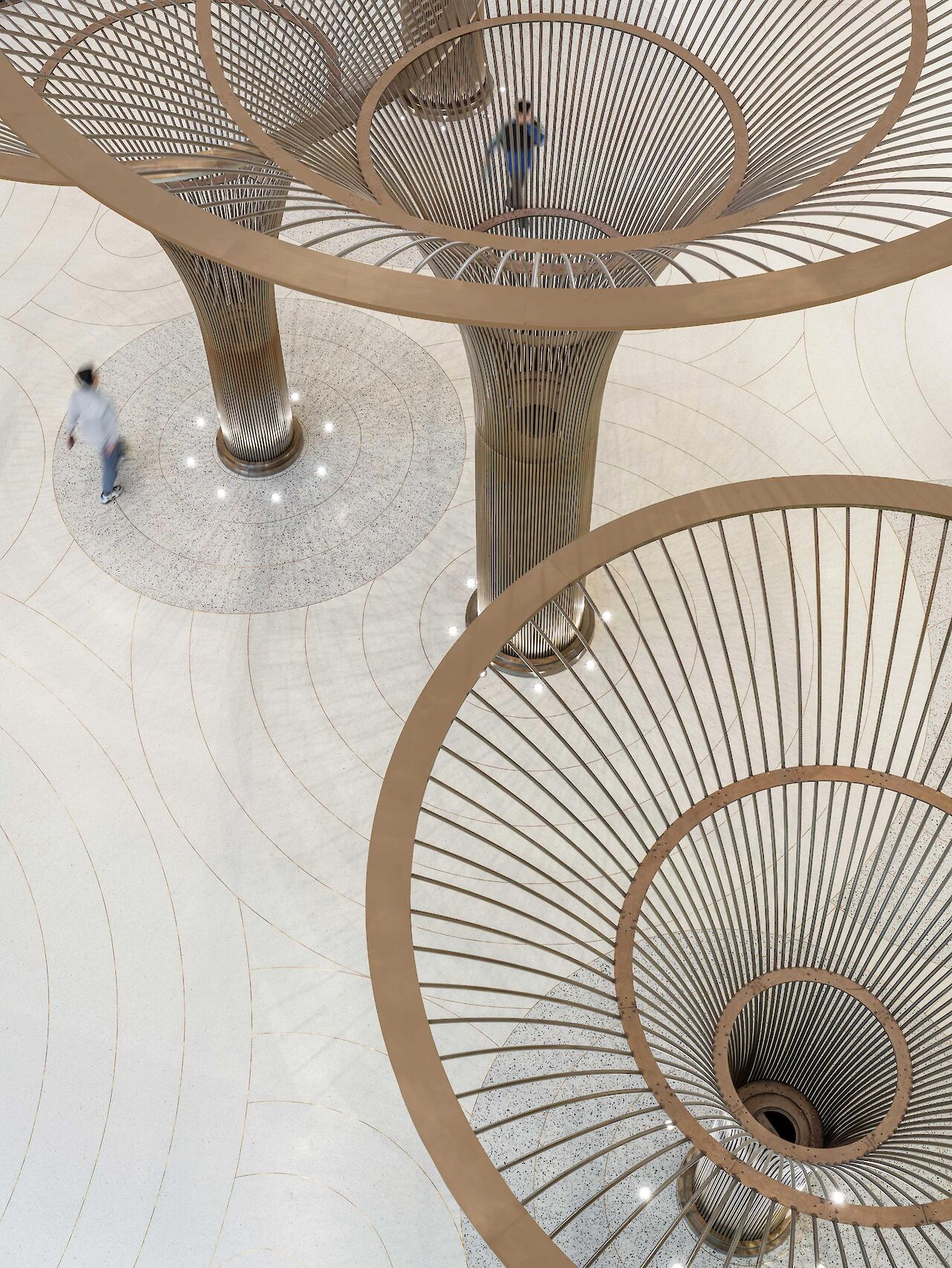 To enhance the visitor experience, the brass tree installations take center stage in an hourly light show, where the atrium lights automatically dim, casting a spotlight on the intricate design of the self-illuminating trees. The choice of brass as a material extends beyond the tree installations, unifying the entire development. Balustrades, lift doors, escalator cladding, and other architectural elements incorporate brass, creating a harmonious and holistic visual identity.