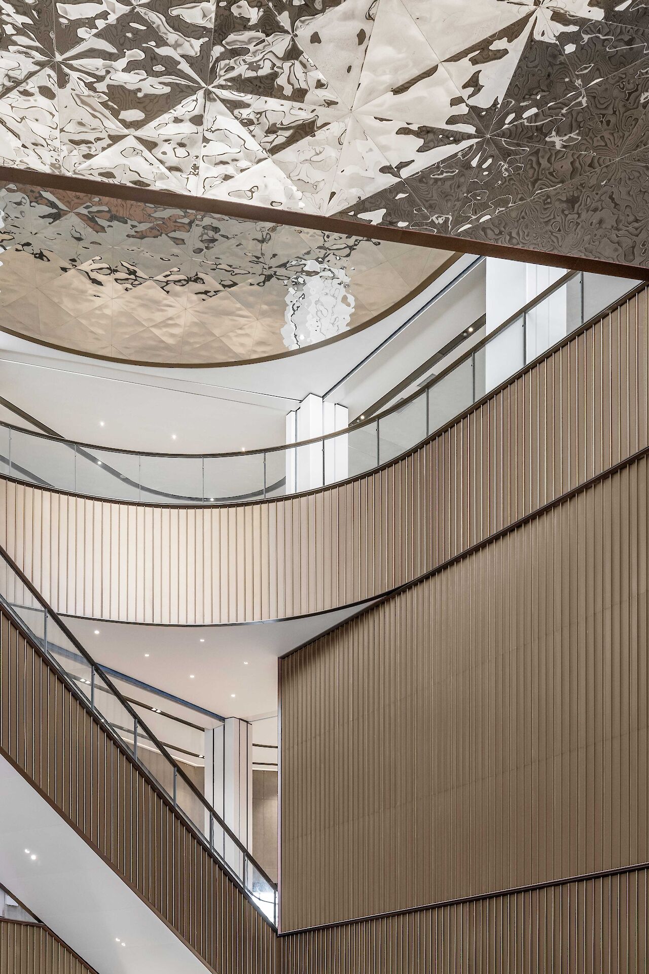 The commitment to a nature-inspired concept extends to the floor patterns - drawn from the natural world- on all levels, reinforcing the 'Community Oasis' theme. Moreover, the ceiling of the atrium is cladded with dented stainless-steel panels, strategically positioned to create a scattered reflection of light throughout the space. This design element mimics the dappled sunlight filtering through leaves in a forest, infusing the atrium with a dynamic play of light and shadow.