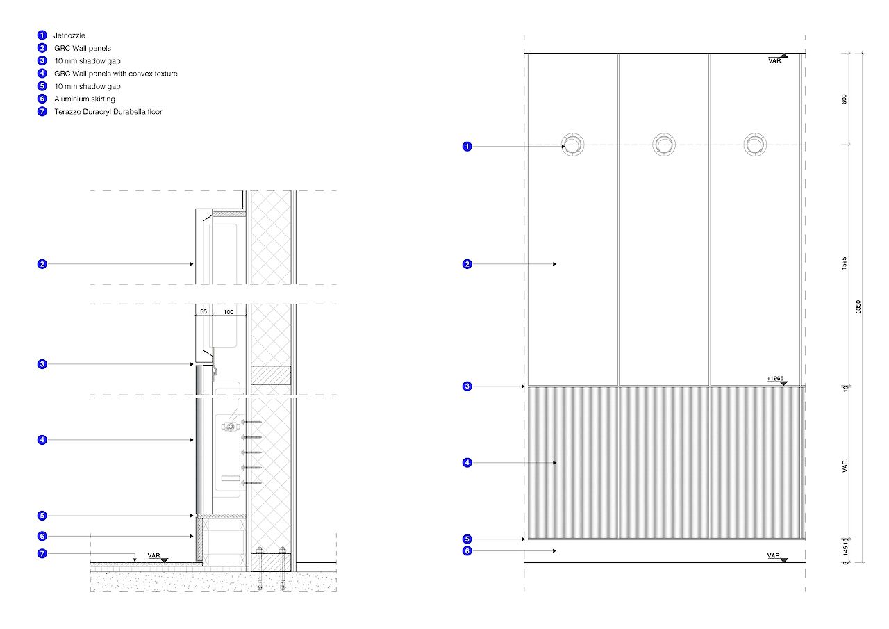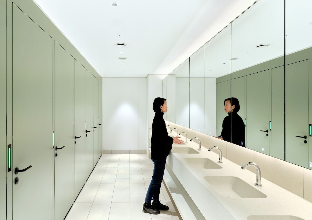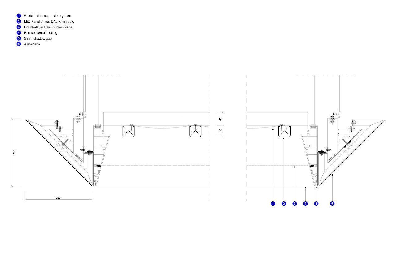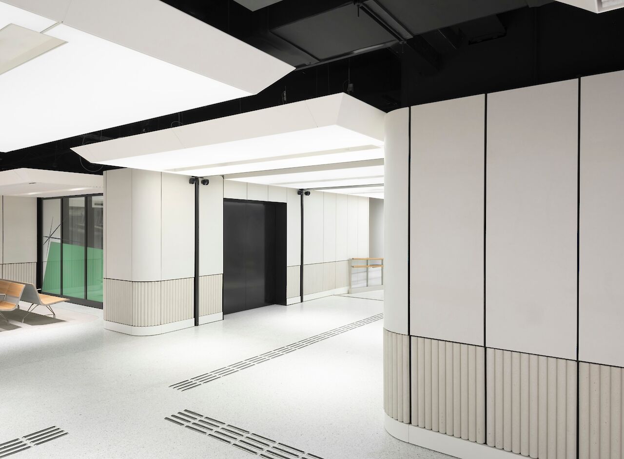 The waiting room forms the final part of the interior concept, in which the relationship between earth and sky is central, a theme that ties in with train travel and is inspired by both Dutch and British landscape paintings from the Golden Age. One of the most striking elements is the floating ceiling with dynamic lighting, with projections of dynamic moving clouds which corresponds to the boarding process. This creates an atmosphere that is both calming and activating.