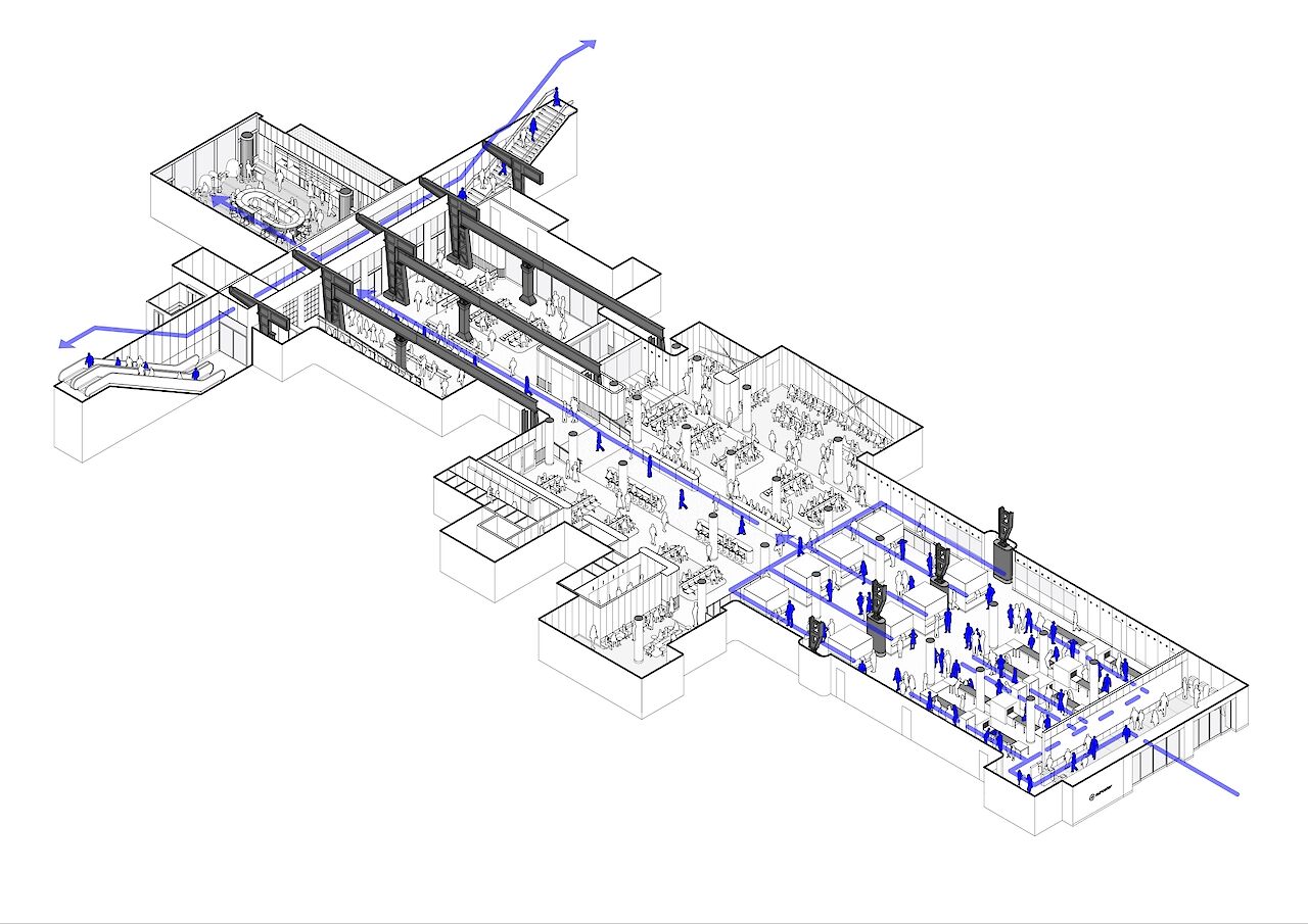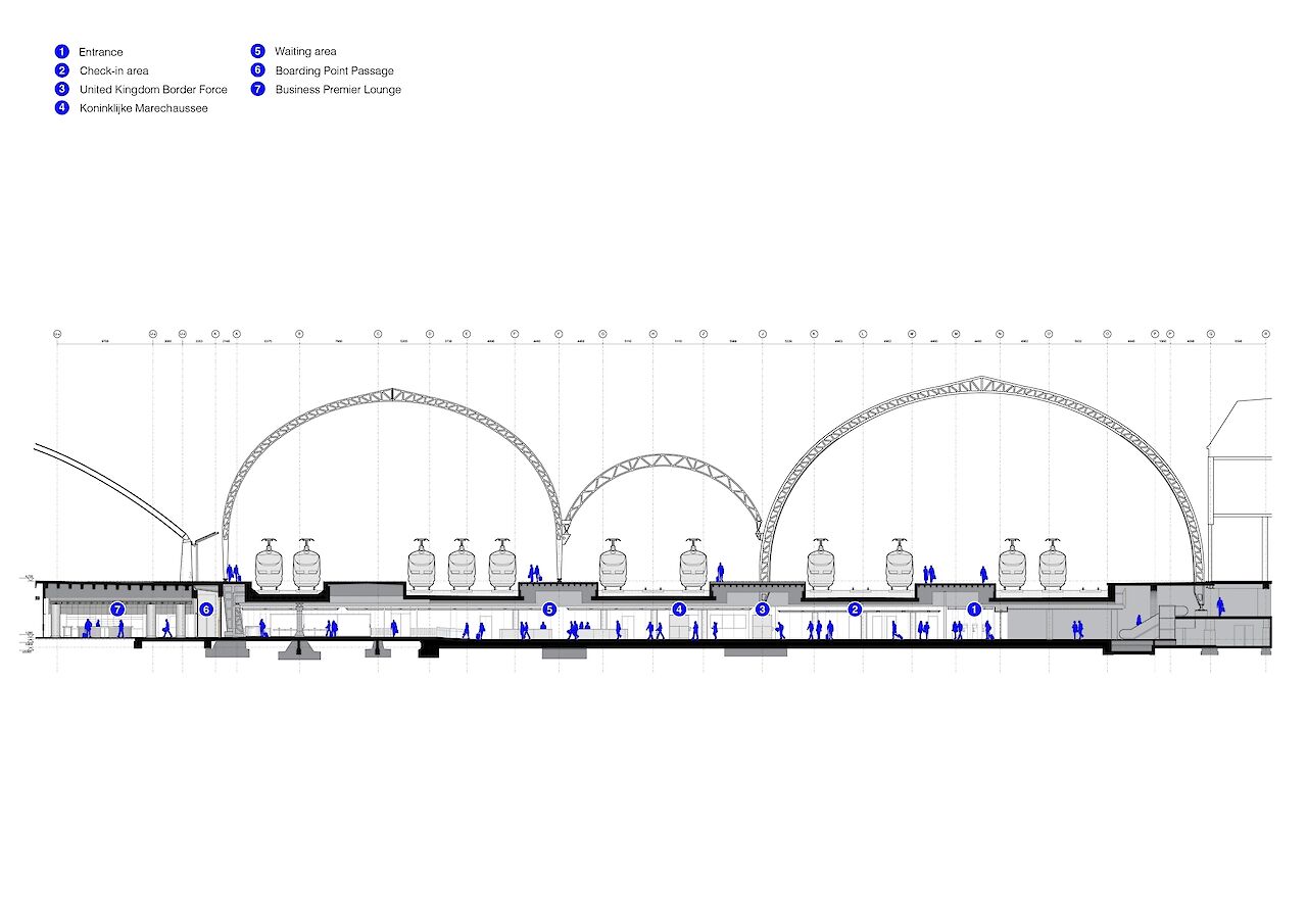 The terminal is housed in the former Amstelpassage, one of the five north-south tunnels at Amsterdam Central Station. A clear circulation strategy forms the foundation of the design and is consistently applied throughout the entire space. Travelers enter the terminal via the main entrance that faces the city, subsequently passing through baggage check and both the Dutch and British passport controls, with adjacent border force facilities, before arriving in the waiting area.