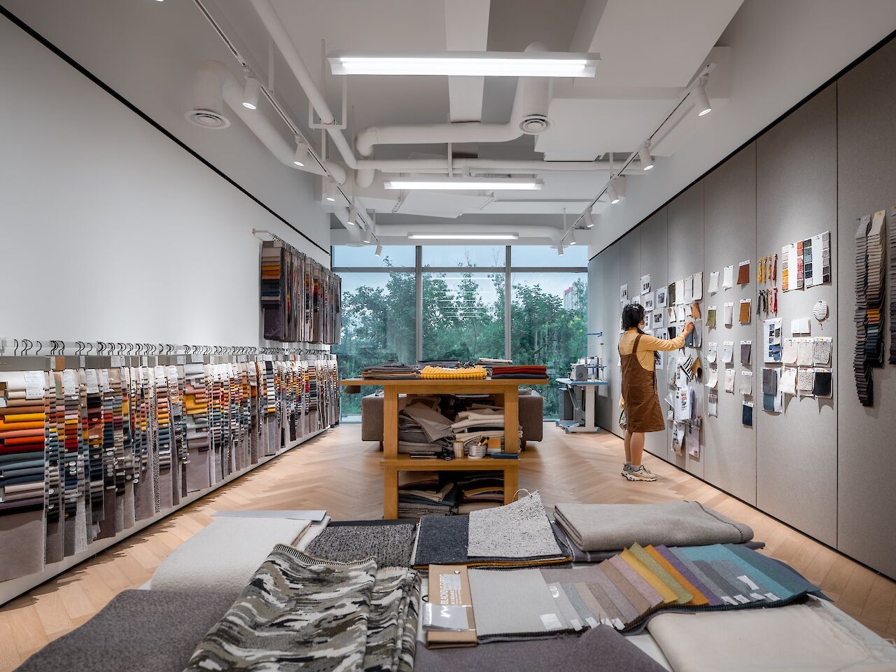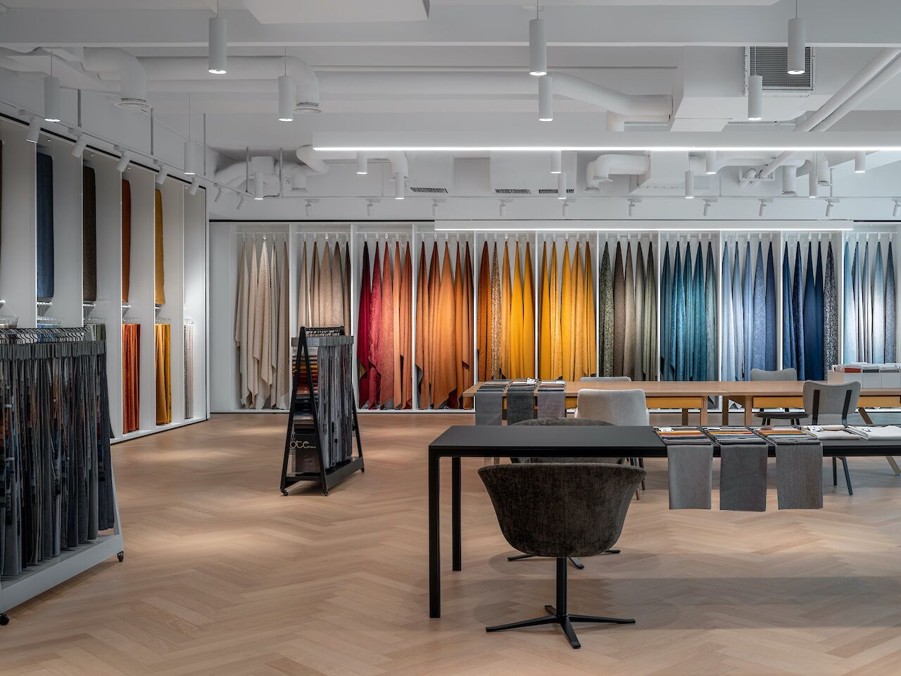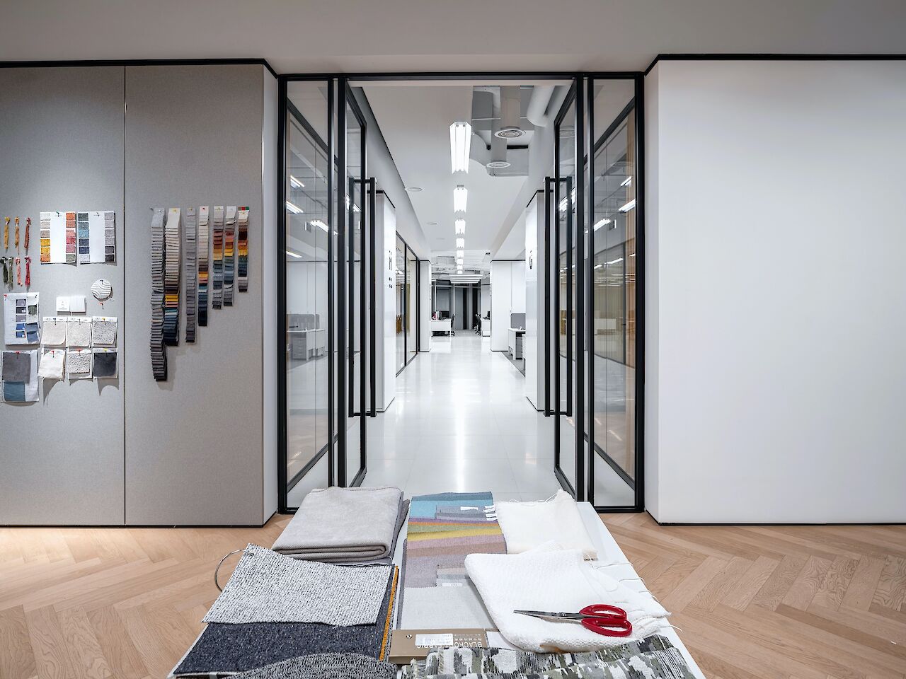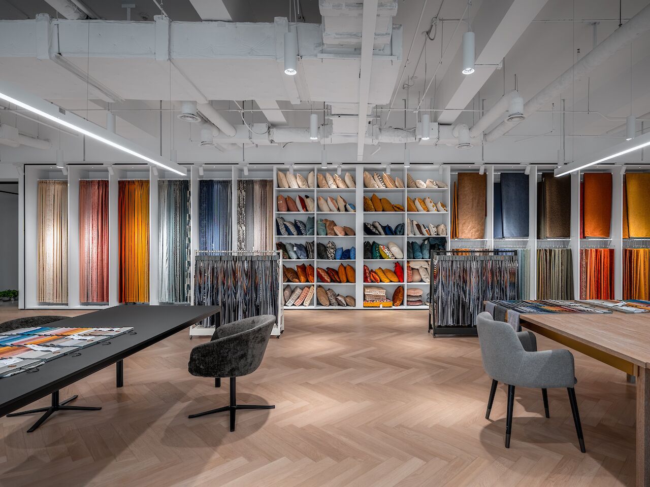 The interior boosts light materials and colors to reflect the daylight into the deep floor plate, but also to provide a calm backdrop to the displayed fabrics. The cabinets are detailed in such a way that it looks like they are placed in later and can be removed again. The use of large amounts of glass provides openness and sense of modernity to the space. Behind the glass, the client’s curtains are used to improve acoustics and privacy when needed. The light fixtures and numbering on the cabinets add refer to the client’s warehouses.