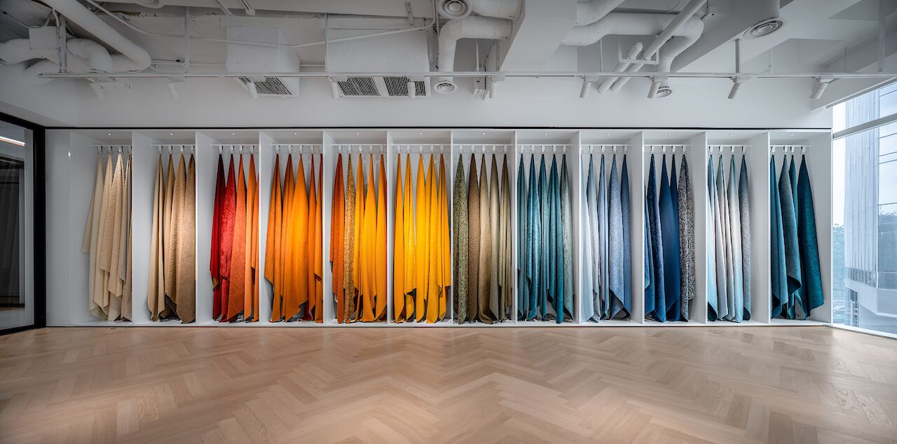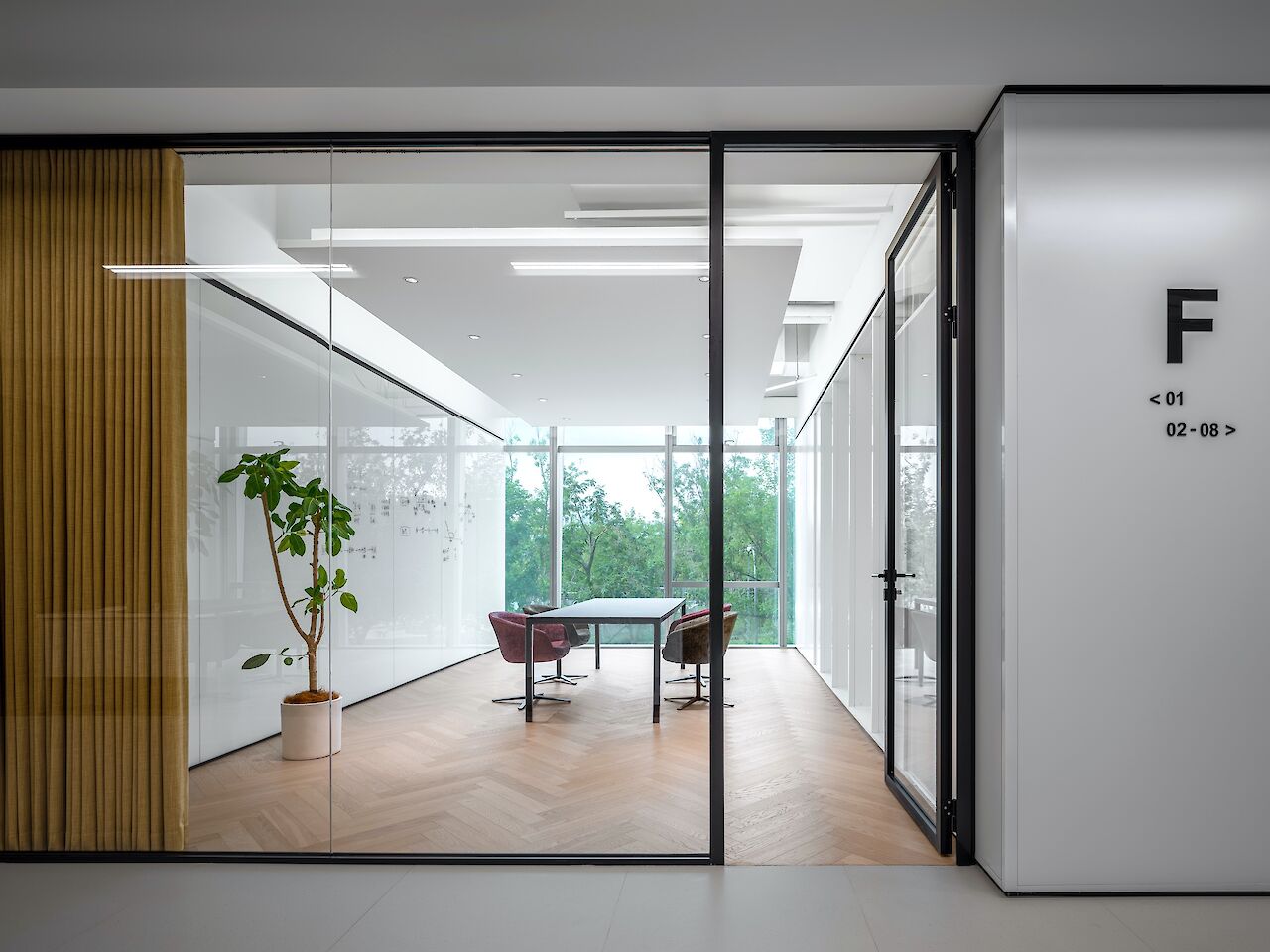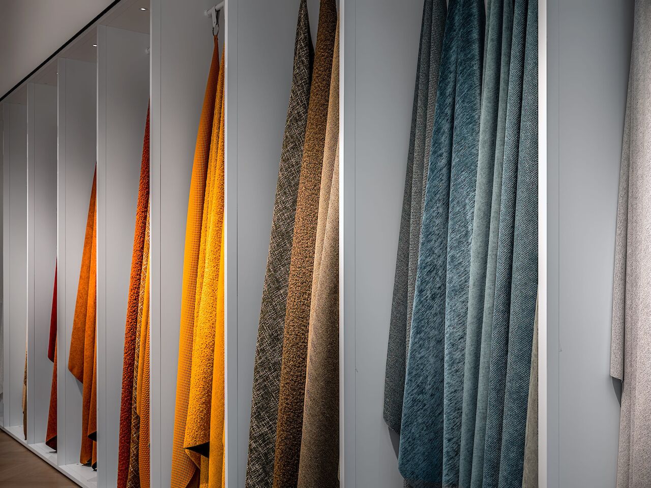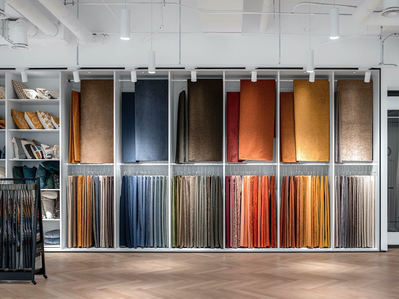 The interior boosts light materials and colors to reflect the daylight into the deep floor plate, but also to provide a calm backdrop to the displayed fabrics. The cabinets are detailed in such a way that it looks like they are placed in later and can be removed again. The use of large amounts of glass provides openness and sense of modernity to the space. Behind the glass, the client’s curtains are used to improve acoustics and privacy when needed. The light fixtures and numbering on the cabinets add refer to the client’s warehouses.