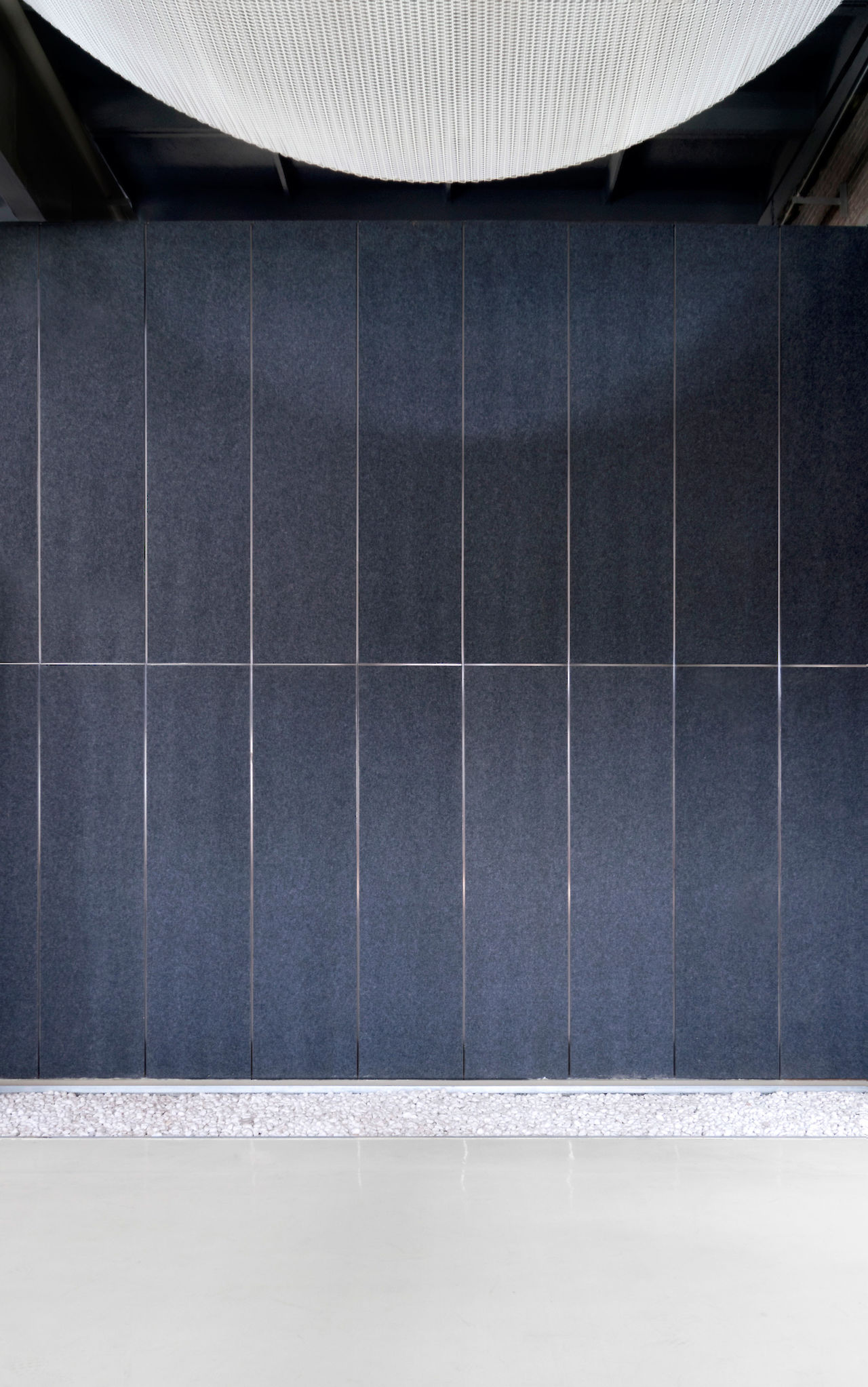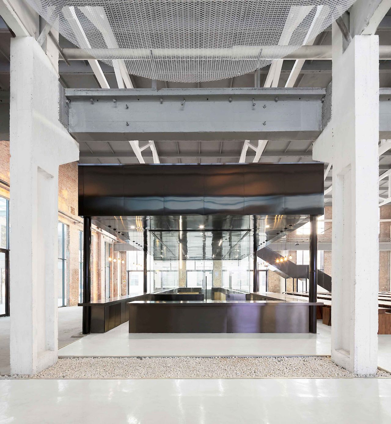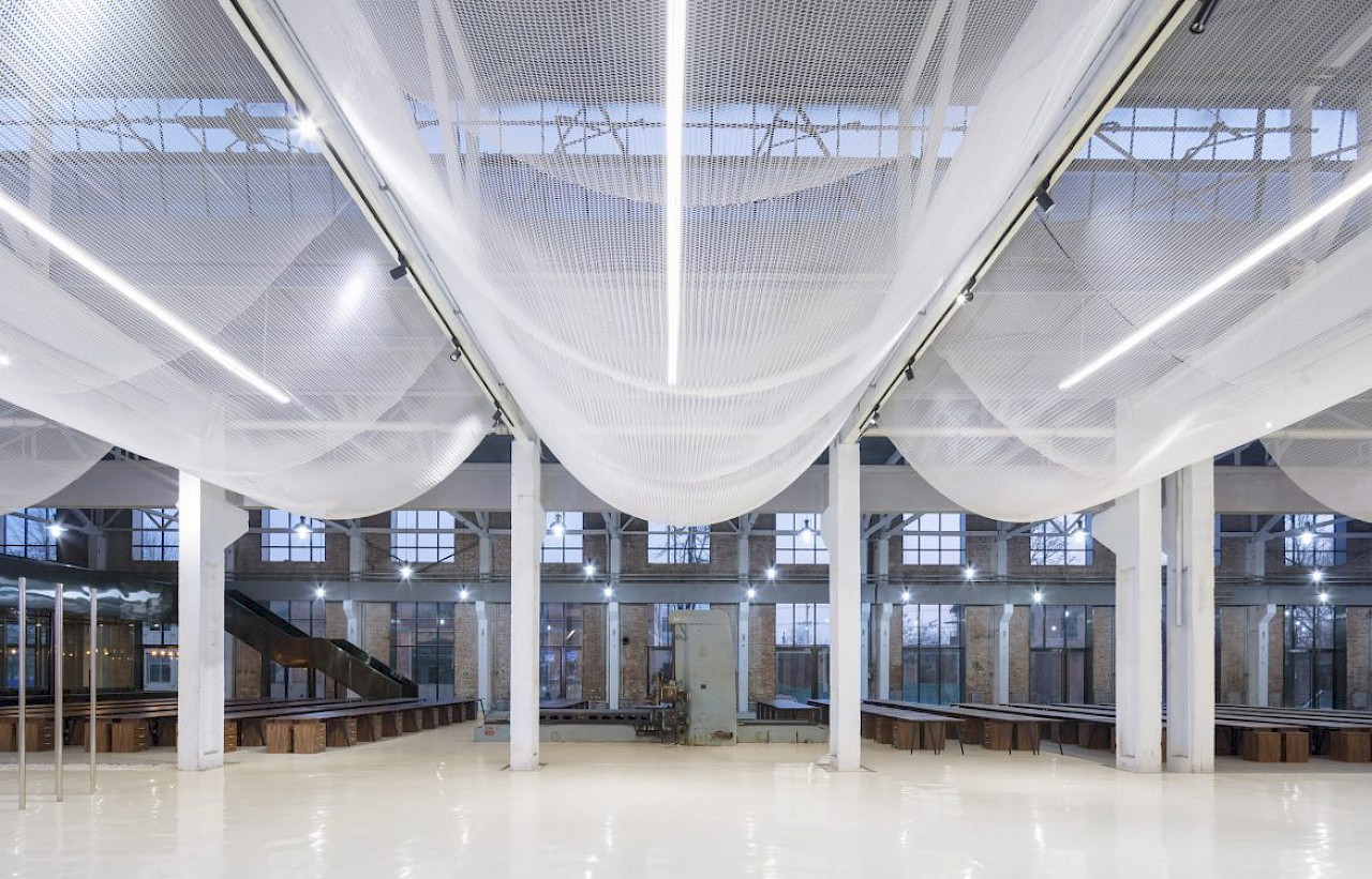 Coinciding with the central catwalk, a white ‘veil’ metal mesh is hung from the ceiling. The ‘veil’ is hung in between the repetitive beams and columns, articulating the rhythmic structure of the architecture. The application of the ‘veil’ helps softening the industrial space. It filters the daylight from the roof light and defines a human scale within the vast space. Light fixtures are placed in between and above the mesh, creating multiple light configurations for different occasions during the evening.