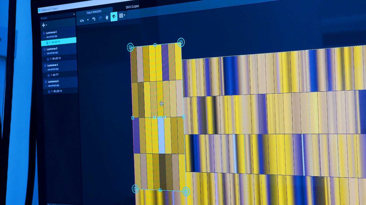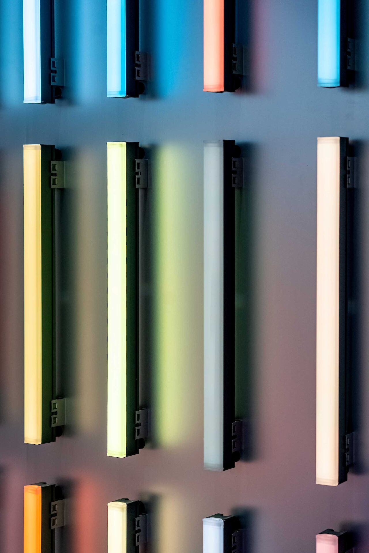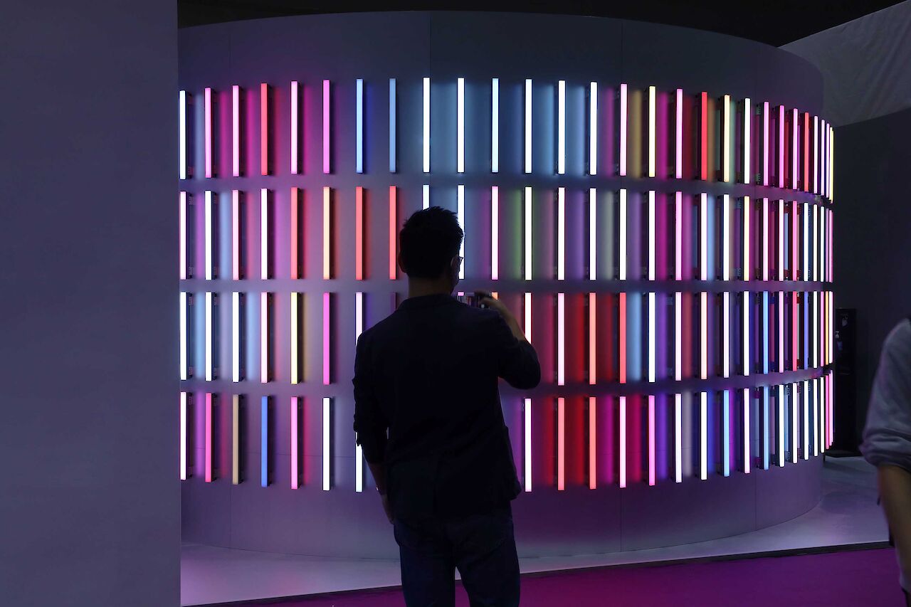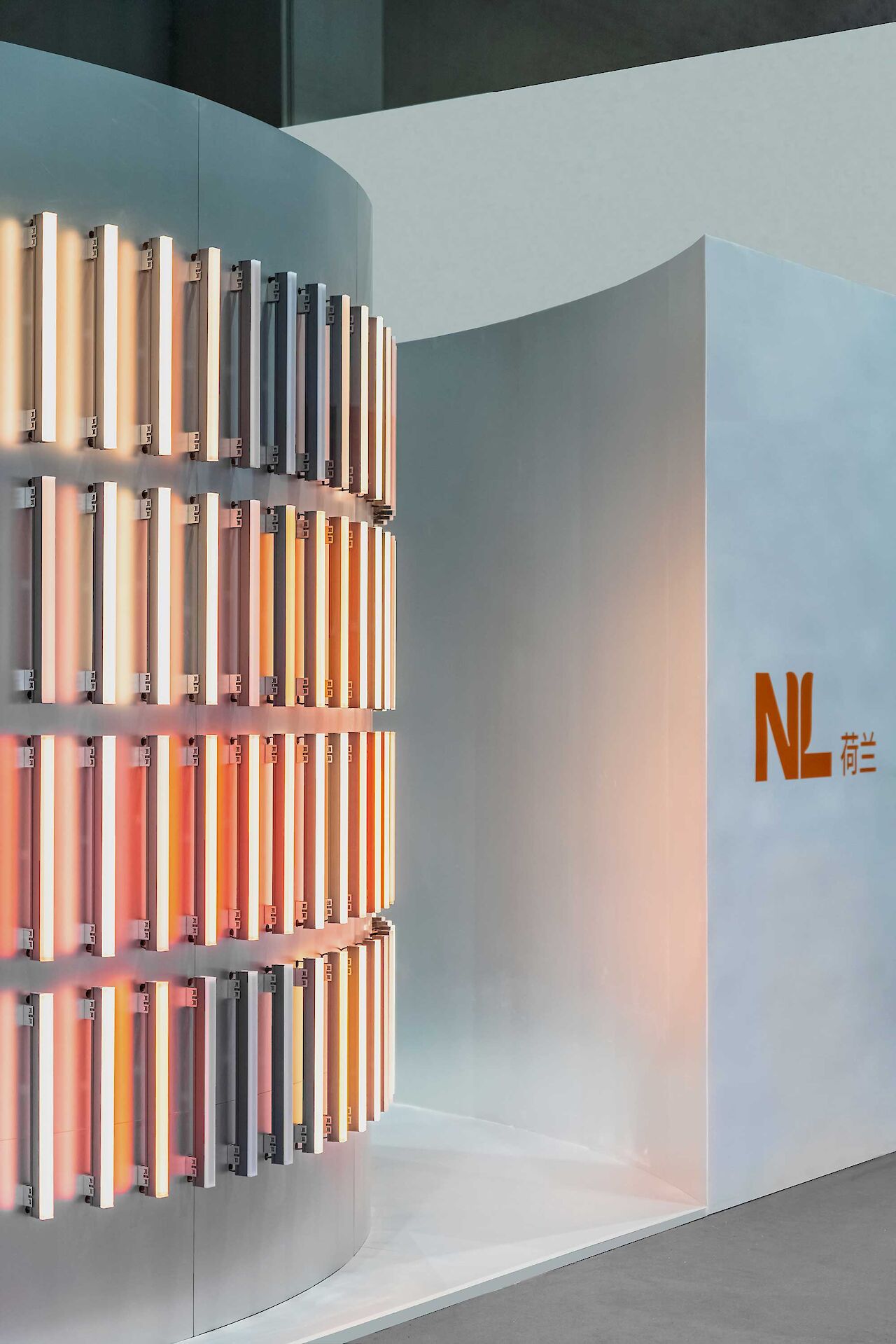 In order to attract visitors into the booth through the power of color, 124 linear LED light fixtures arranged in 4 horizontal bands are mounted to the exterior of semi-circular wall. The horizontal bands are an abstract representation of the typically colorful Dutch flower fields. Multimedia designer Shard Island developed an interactive script for the pavilion lights. When there is an event happening in the pavilion, it directly converts real-time presentations into abstract colors through the LED lights on the exterior curved wall. This innovative representation is achieved by streaming the presentations through a wireless transmission system and with advanced interactive multi-media technology.