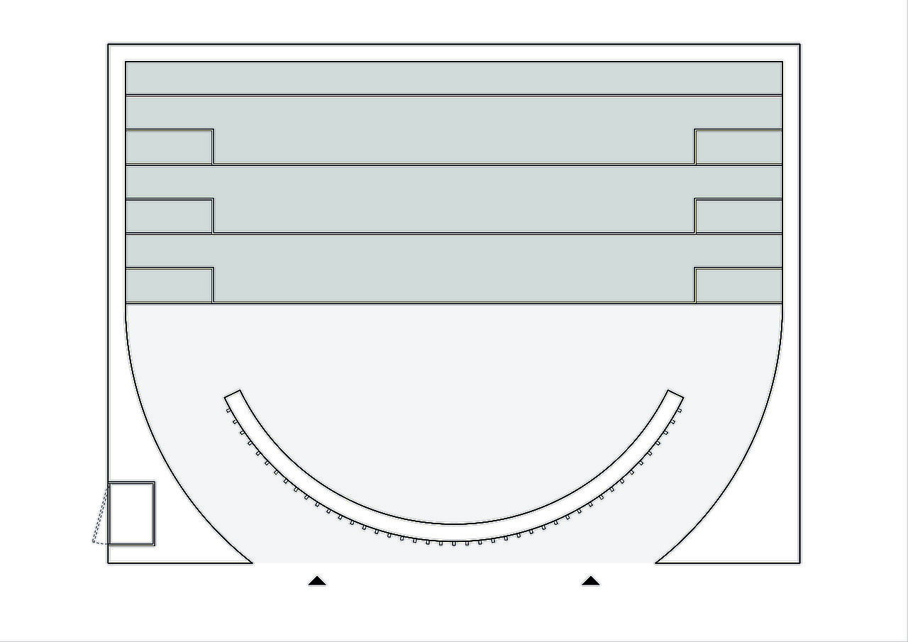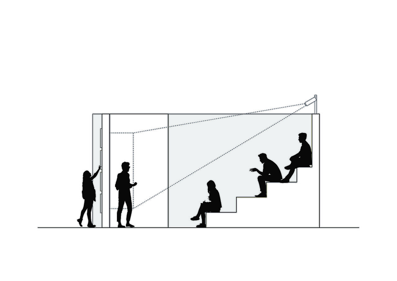 The pavilion is located on a small exhibition plot of 48 square meters. In order to create an intimate atmosphere for design sharing, a semi-circular wall separates a small auditorium from the exhibition hall. The curved wall naturally provides a comfortable circulation and allows people to enter the auditorium space from both sides. The auditorium has steps, which provide seating with optimized views towards the stage.