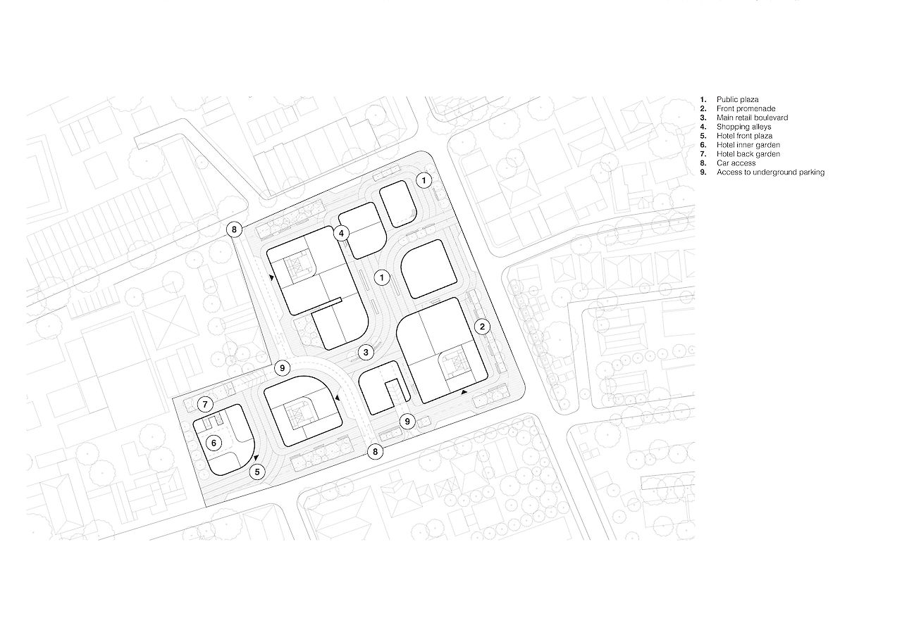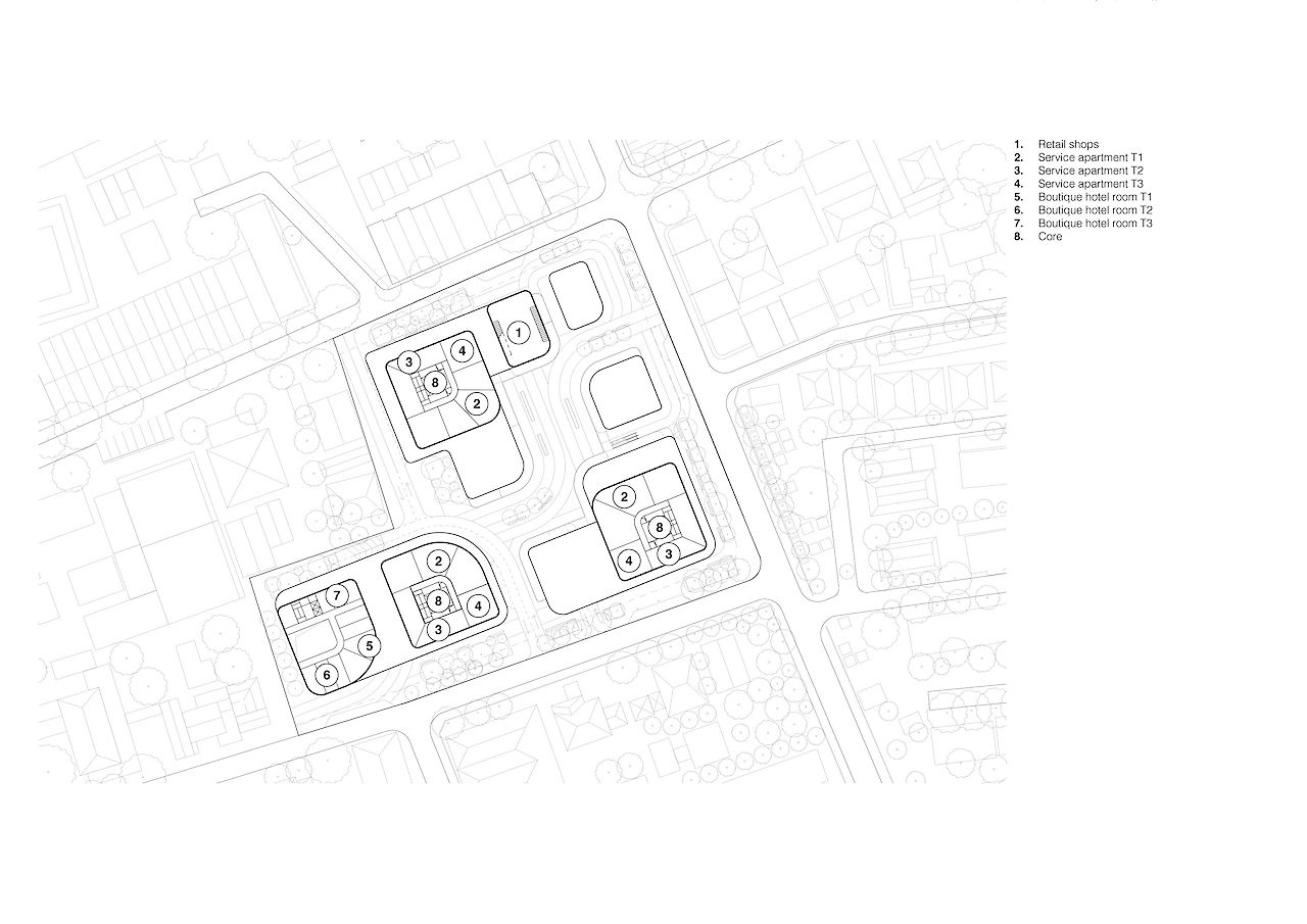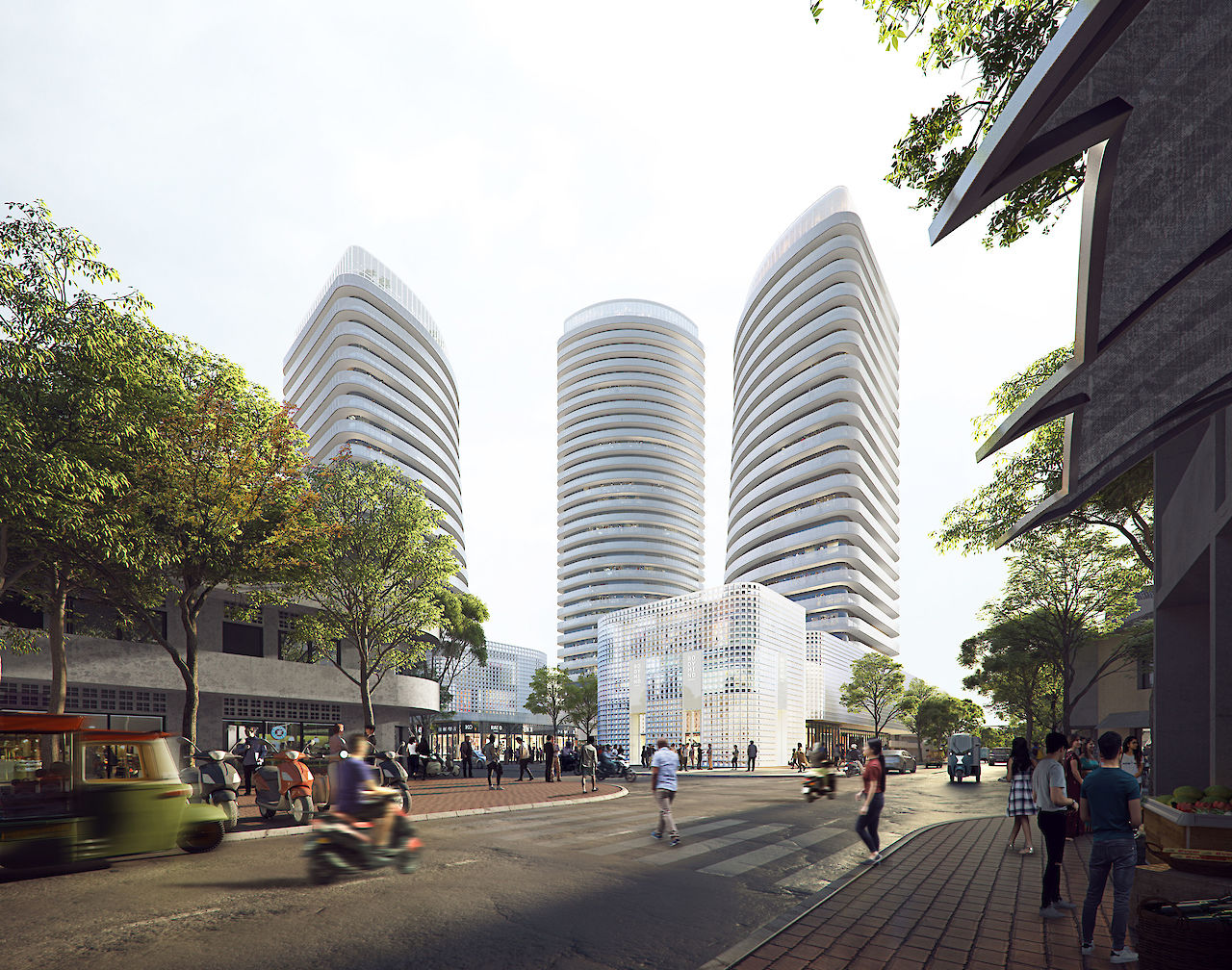 The commercial functions are located in building block of no more than 3 stories high to find a relation with surrounding building blocks. The façade on ground floor is slightly pushed back in order to connect to the canopies of surrounding shops. Towers taper towards the top to make them less imposing in the Phnom Penh skyline and to refer to the ancient Khmer Architecture.