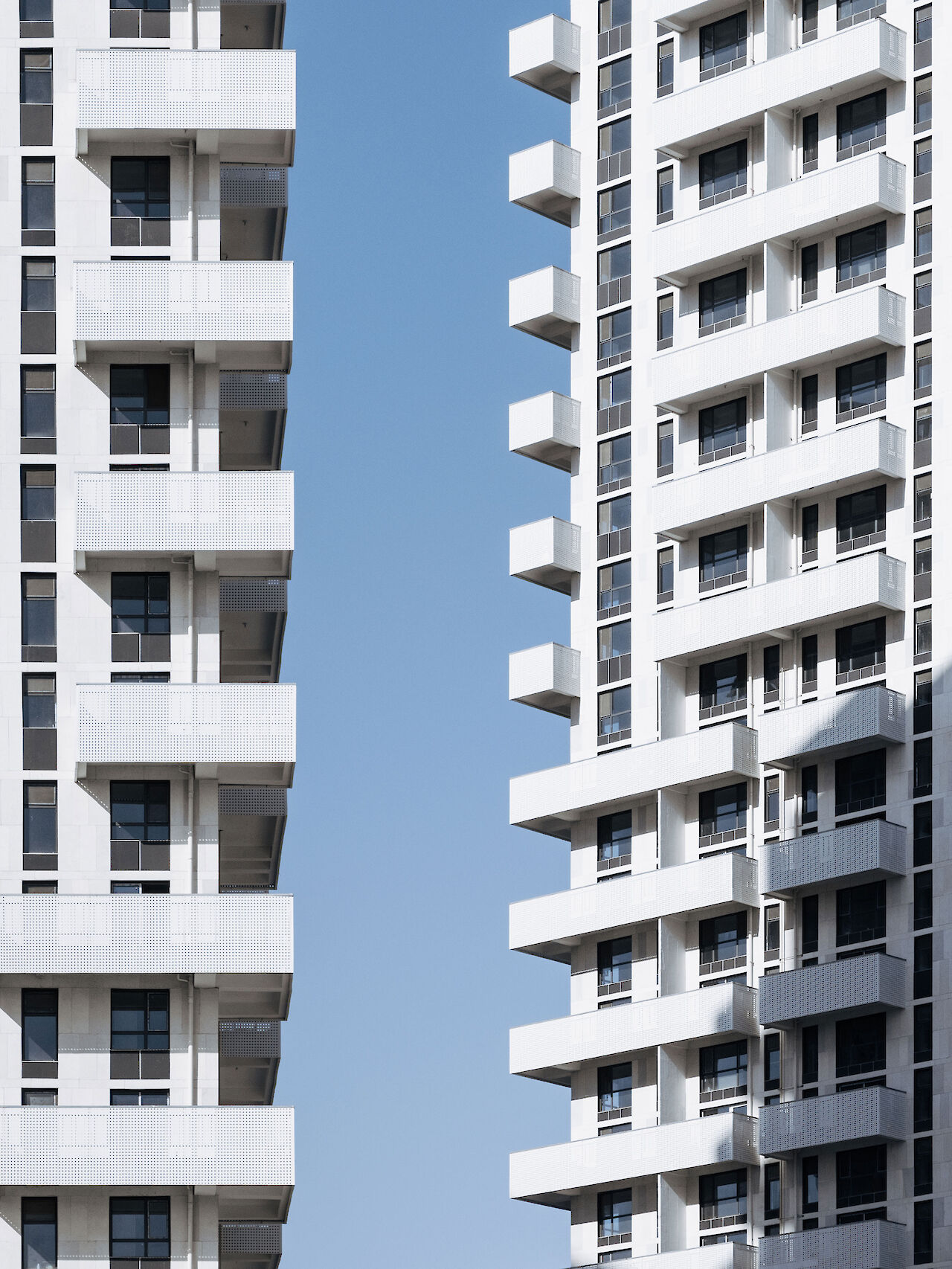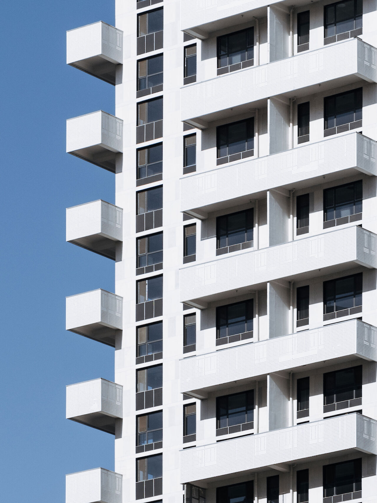 Keeping the construction budget low was key to achieving an inexpensive and affordable development for the Y-generation. By using the balconies as sculptural elements, the project could refrain from expensive façade materials and from poorly detailed façade beautifications often seen in surrounding developments. Instead Superimpose opted for a simple yet refined material palette of white facades with contrasting dark aluminum window frames and panels, together with slightly reflective glass. The balconies have been cladded with white perforated aluminum.
